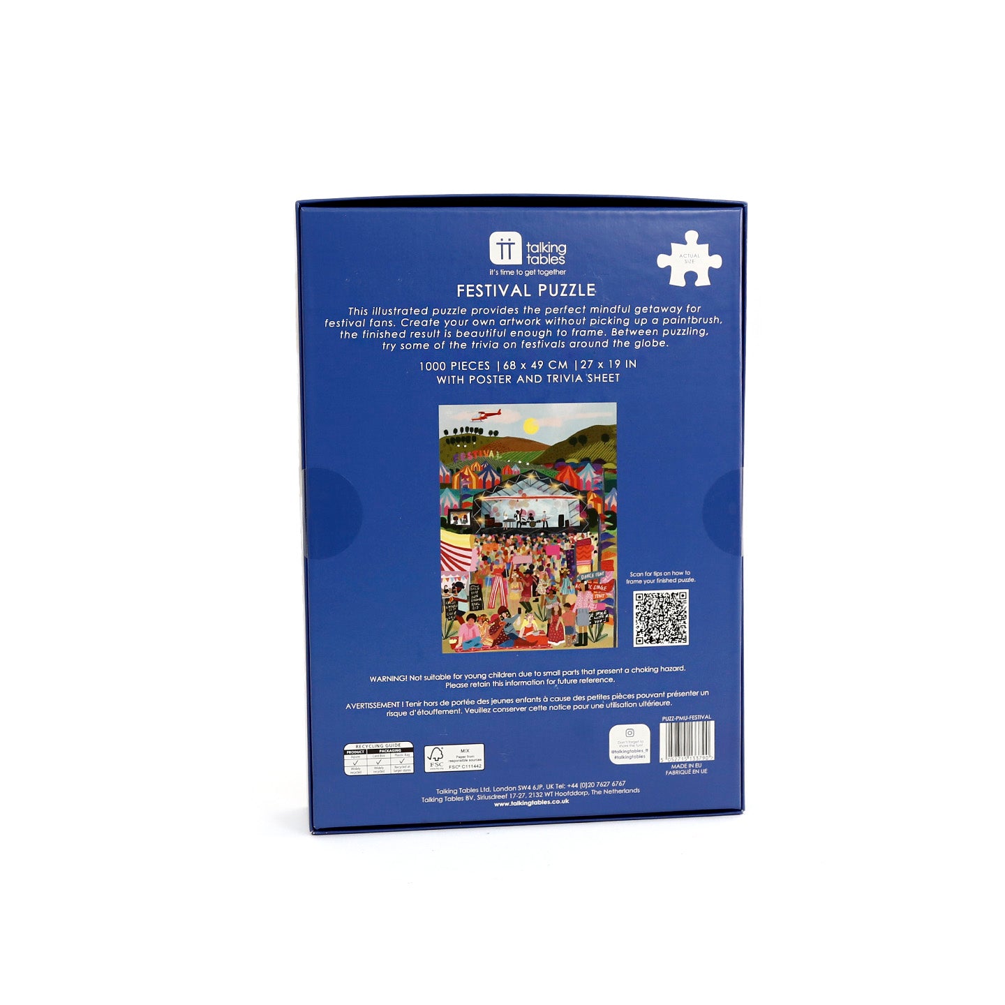 Music Festival 1000 Piece Puzzle by Talking Tables. From Summerfest to Coachella, spark a memory in your customer of seeing their favourite band live with this festival jigsaw puzzle. In this colorful scene, piece together the main stage, festival tents, and crowd of busy festival goers as they dance and sing to their favourite band. An added extra for your customers to enjoy, this 1000-piece puzzle also comes with a matching poster of the finished design and 20 trivia questions to test their knowledge.