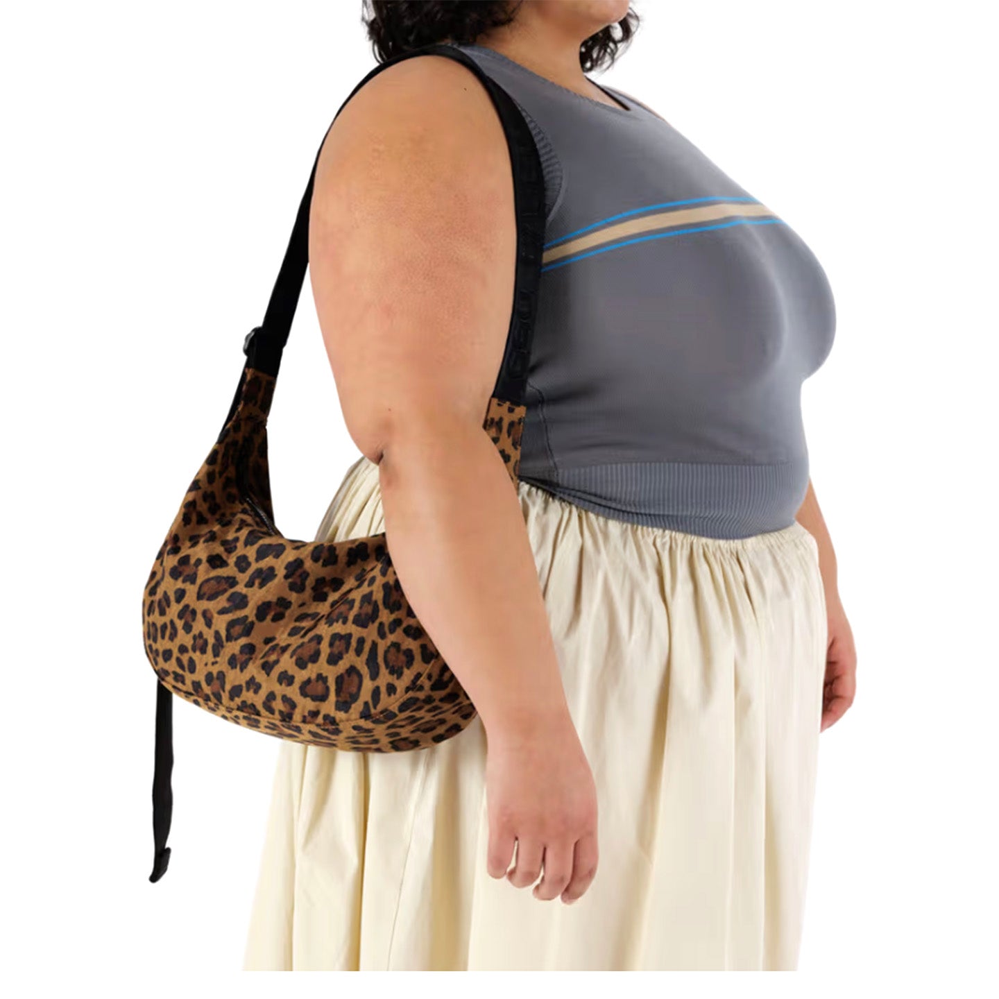 Practical doesn't have to be boring. The popular crescent shape in a new, larger size that still fits a phone, wallet, and sunglasses with room to spare.