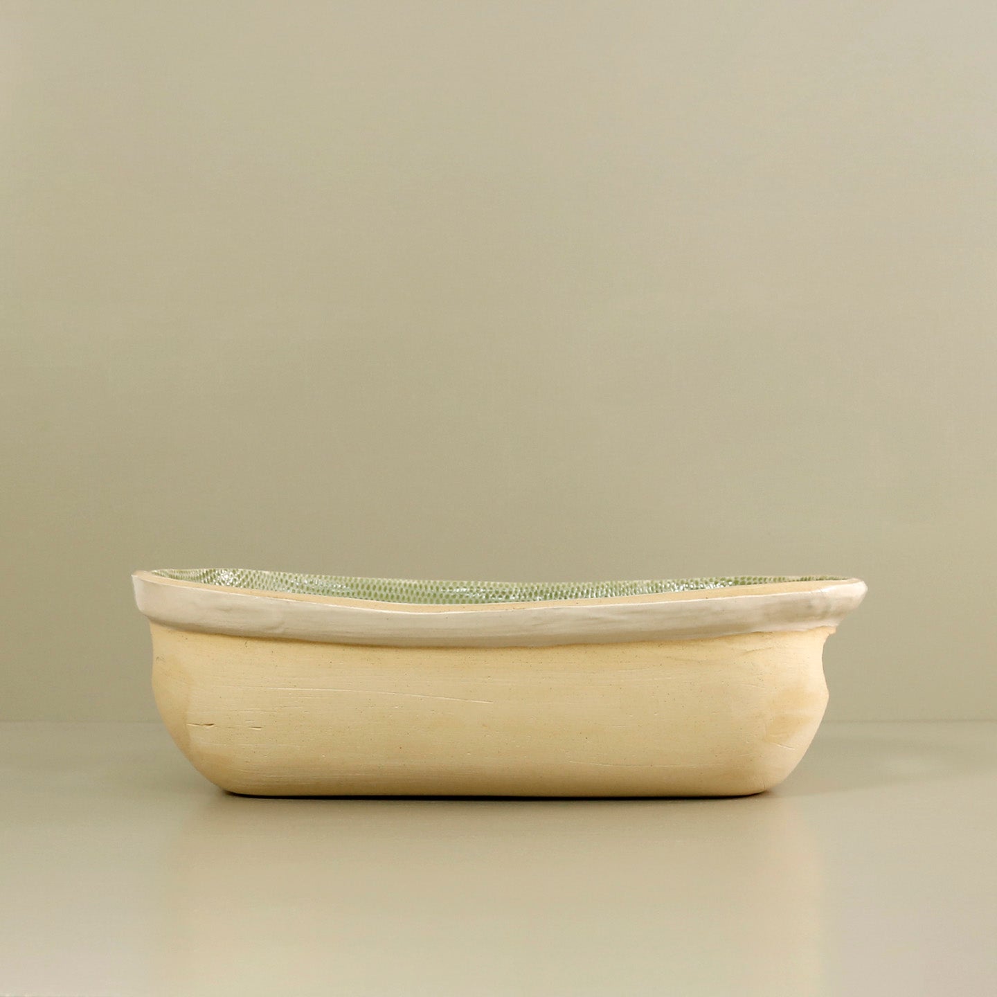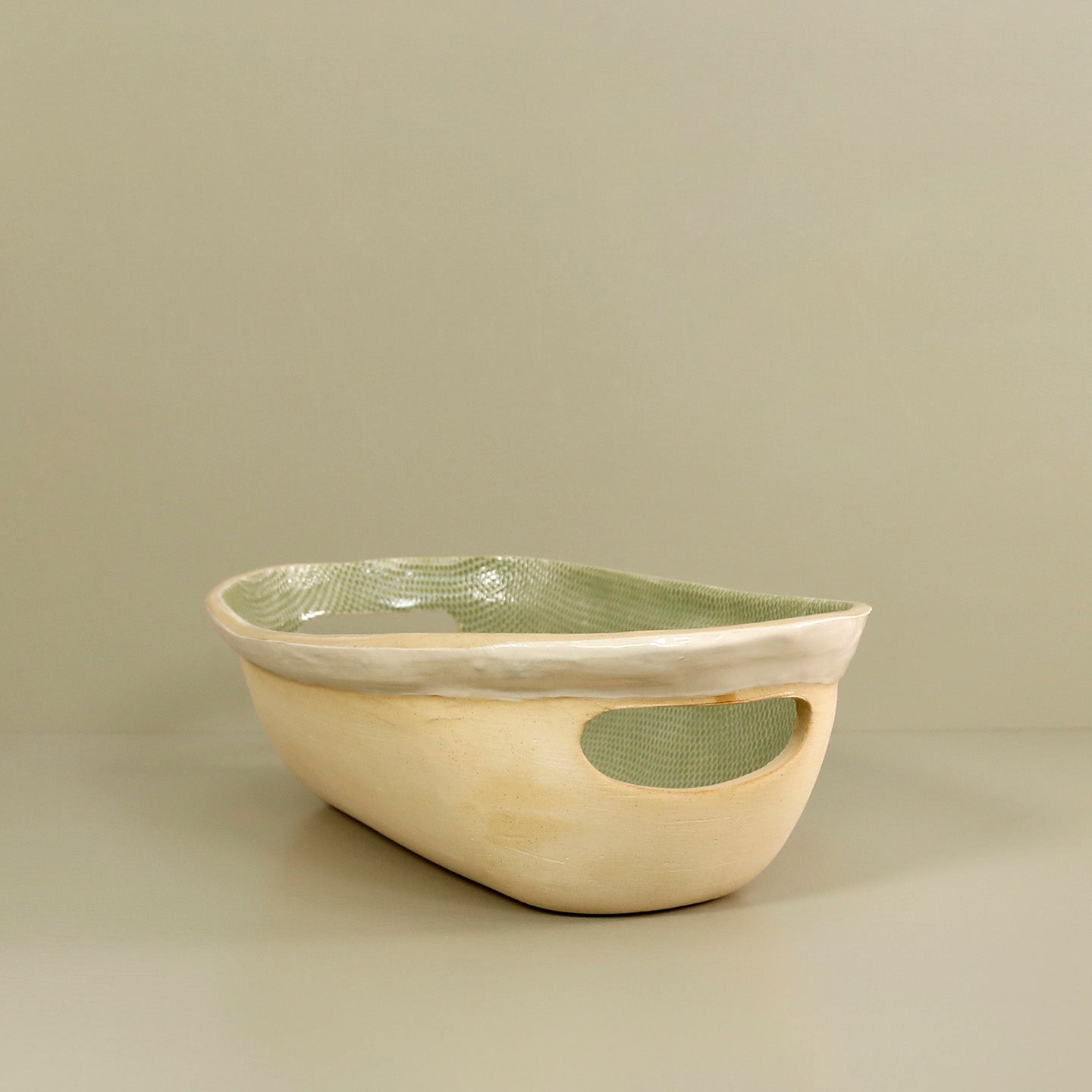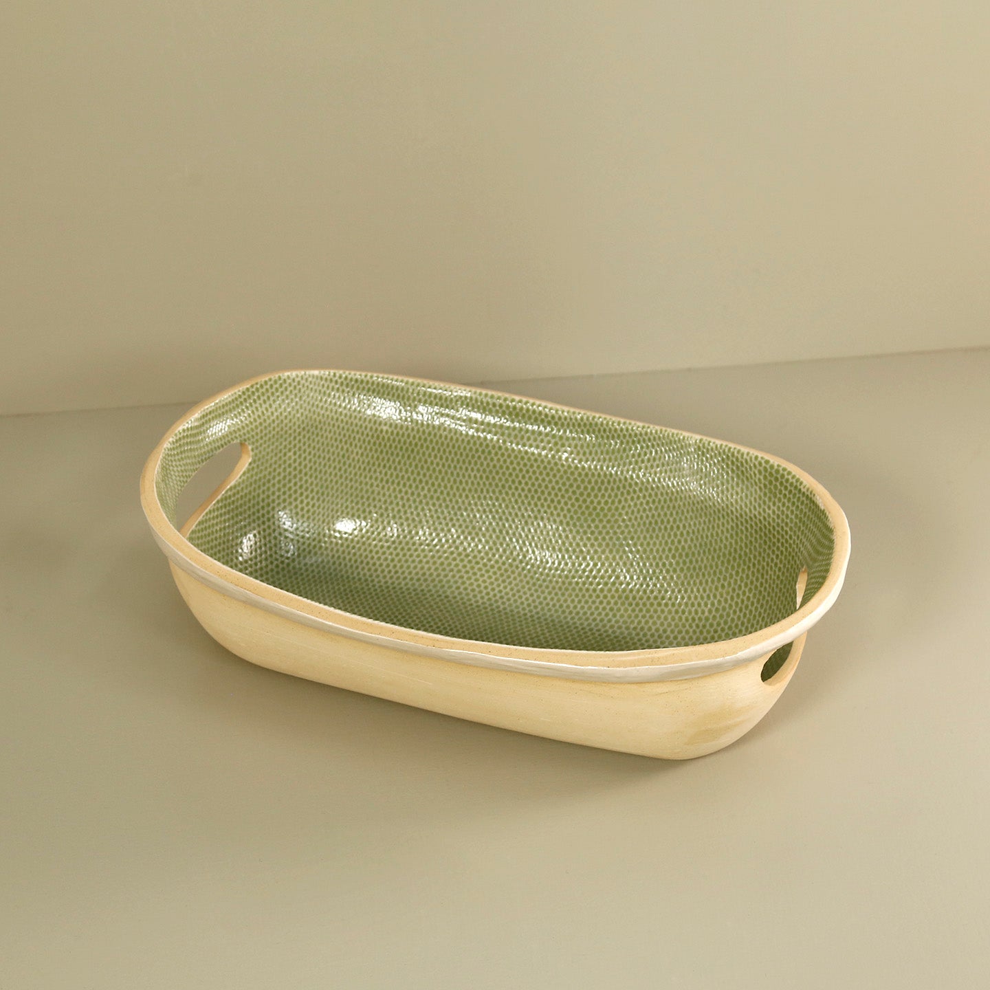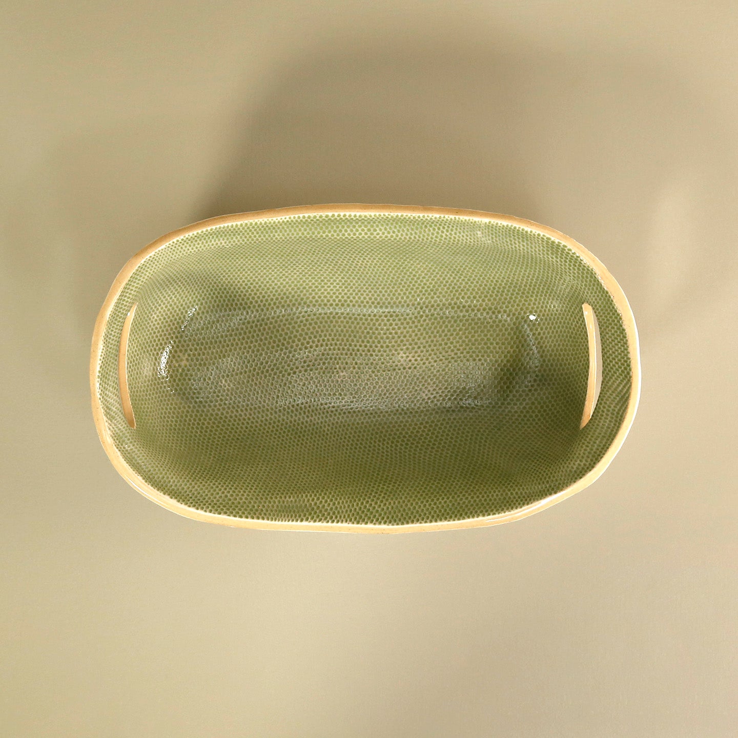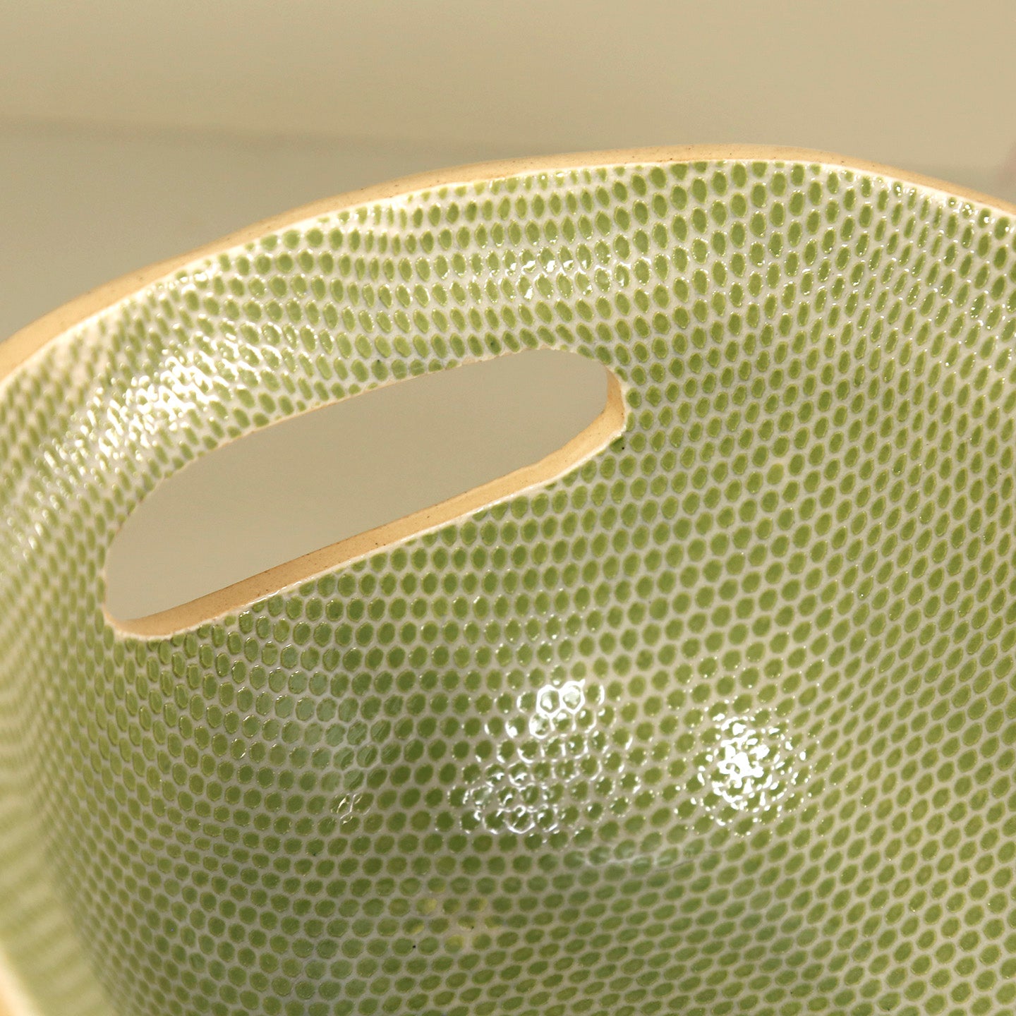 Handmade ceramic bread caddy with cut-out handles made using a unique process of glazing over lace and materials to create gorgeous designs and texture. Each piece is signed and dated on the bottom.
