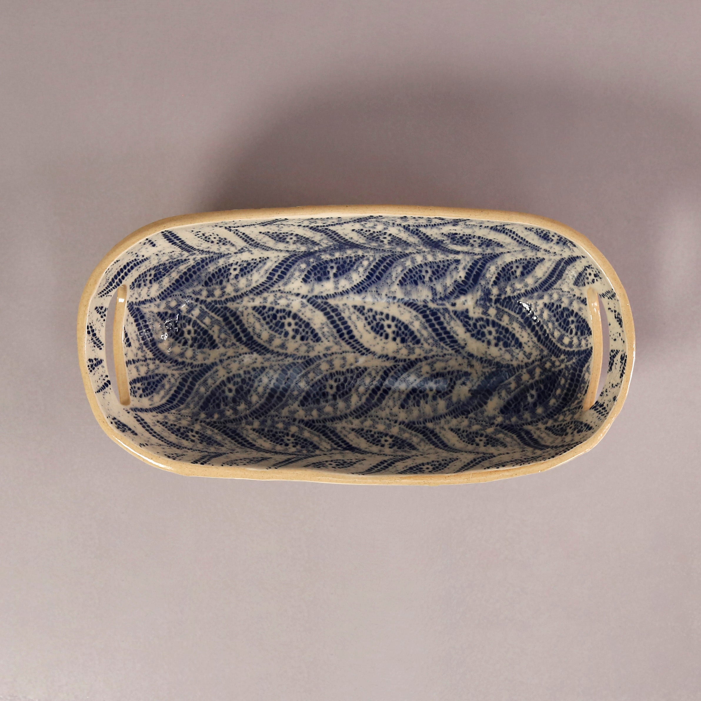 Handmade ceramic bread caddy with cut-out handles made using a unique process of glazing over lace and materials to create gorgeous designs and texture. Each piece is signed and dated on the bottom.