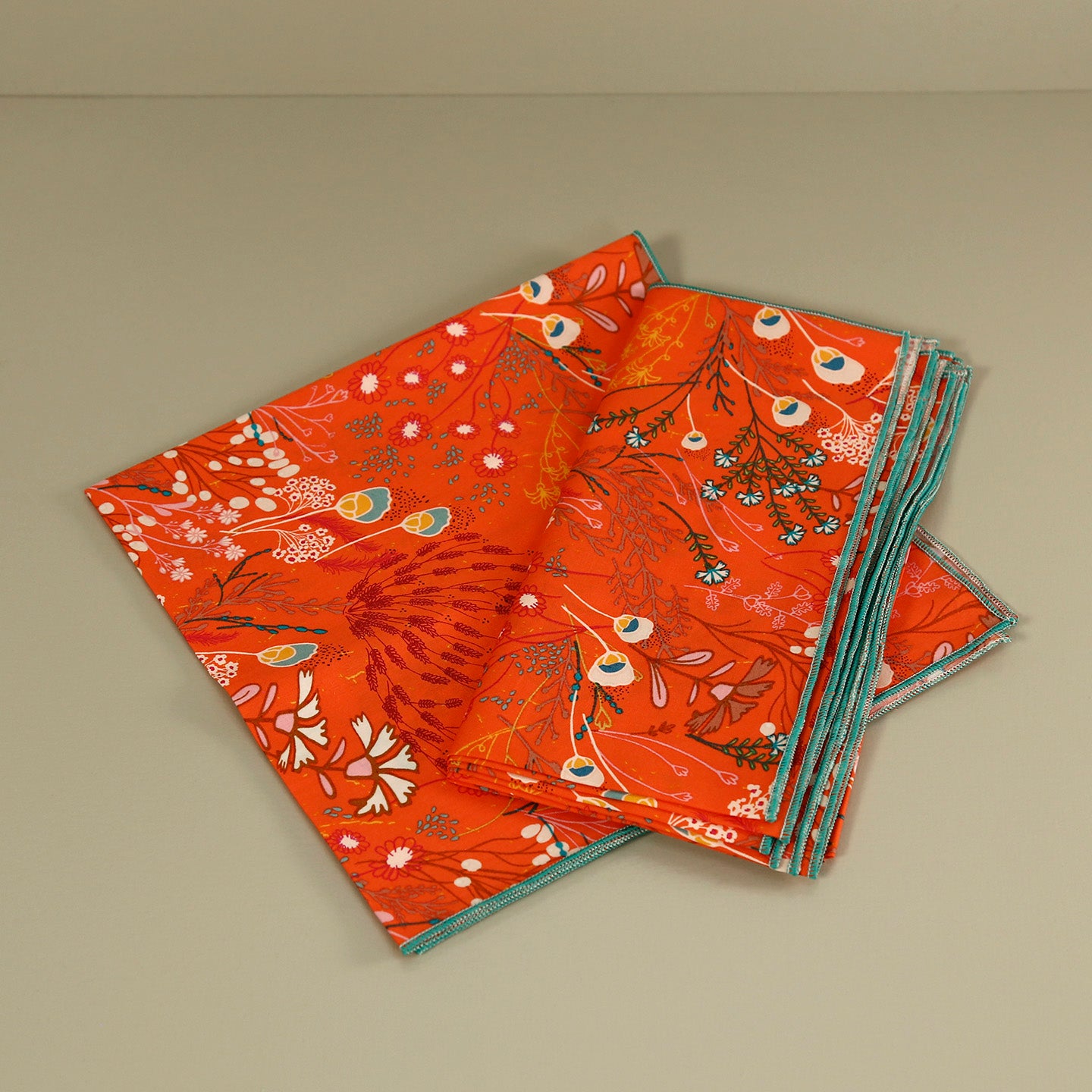 This set of four 100% cotton floral napkins will bring a pop to any table. Use everyday or to dress up the table for a party! Cloth napkins are more sustainable than paper napkins, as they can be reused multiple times. They are also more absorbent, making them ideal for wiping up spills and messes. Additionally, cloth napkins can add a touch of elegance to any dining table.