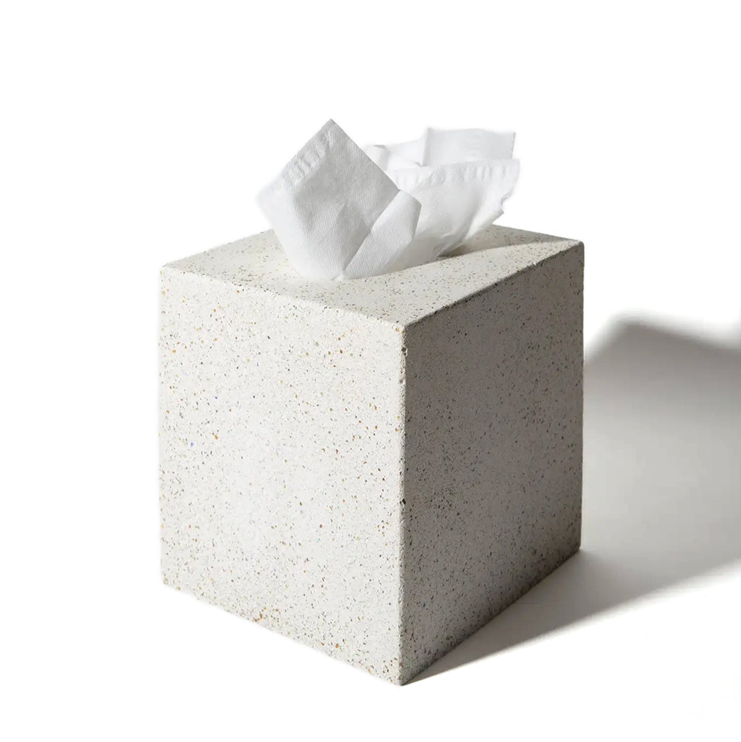 Sleek concrete holder designed to fit standard vertical tissue boxes. Features a modern white terrazzo finish that complements any room's décor while keeping tissues neatly contained and easily accessible.