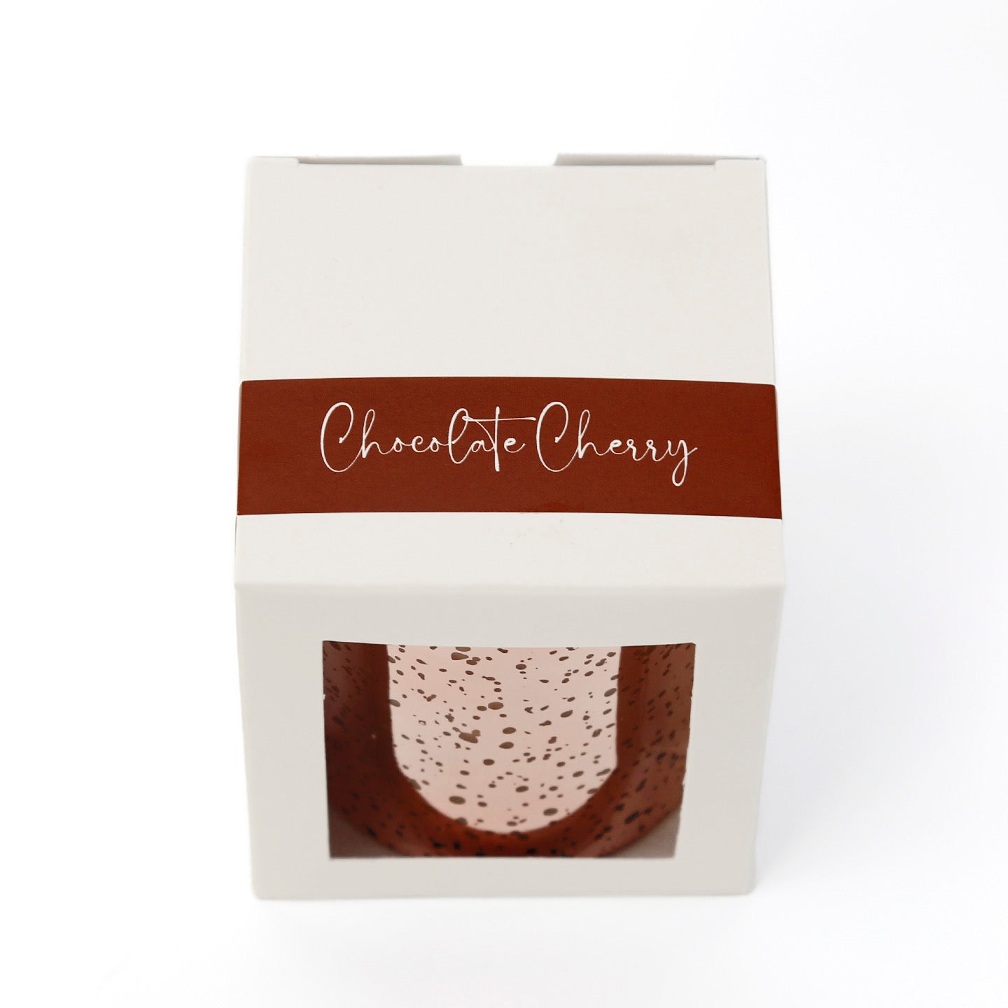 Handmade soy candle made with blended plant-based organic fragrance oil of cherry and chocolate and essential oil of vanilla for a clean burning candle.