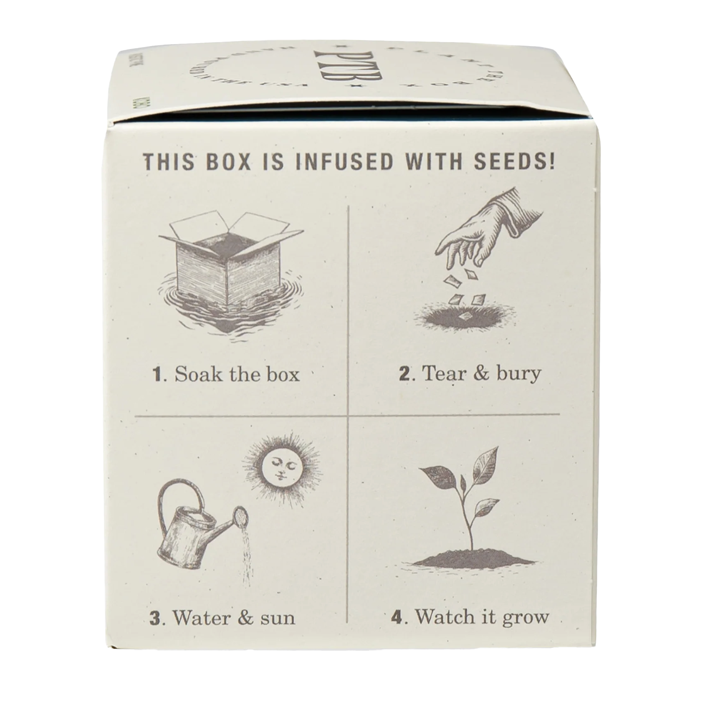 Don't forget to plant your box! This plantable seed candle is crafted with sustainable, US-grown soybean wax and a cotton wick. Each box is infused with native seeds to grow plants that are fragrant to match the candle's scent.