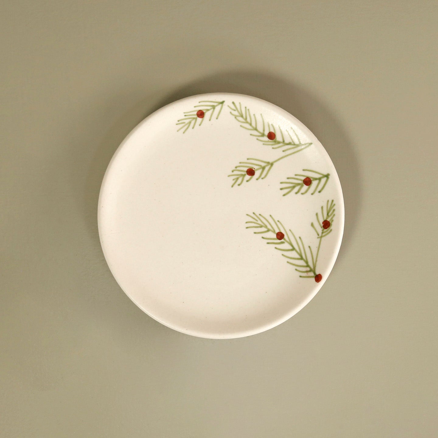 Add a festive touch to your table with this handcrafted ceramic appetizer plate, featuring a charming holly design in rich green and red encircling the rim. The warm cream backdrop offers timeless elegance, perfect for serving hors d'oeuvres, cookies or sweet treats throughout the holidays.
