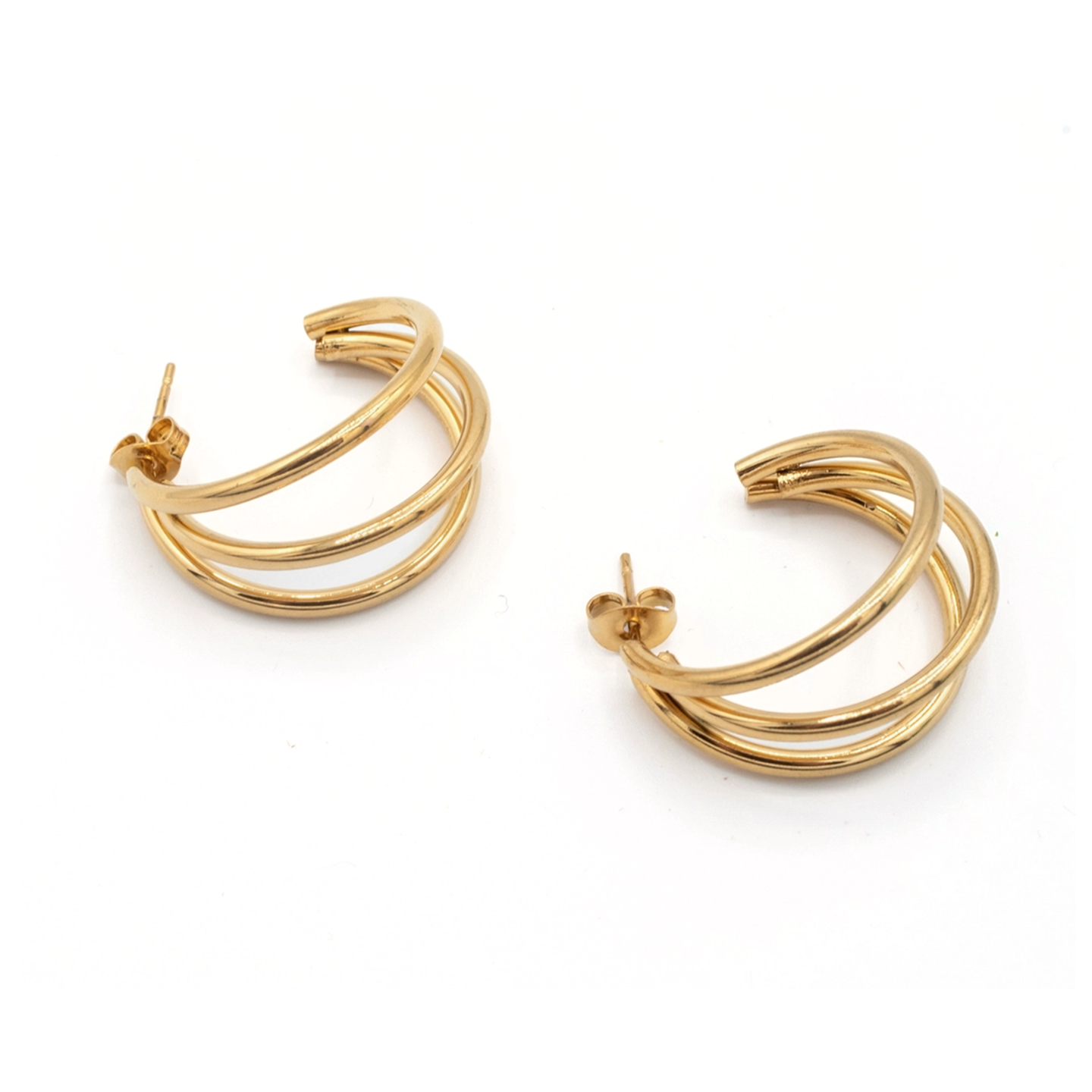 This triple loop hoop earring features a sleek design crafted from gold-plated stainless steel. Its layered loops create a stylish yet versatile look, perfect for everyday wear or special occasions.