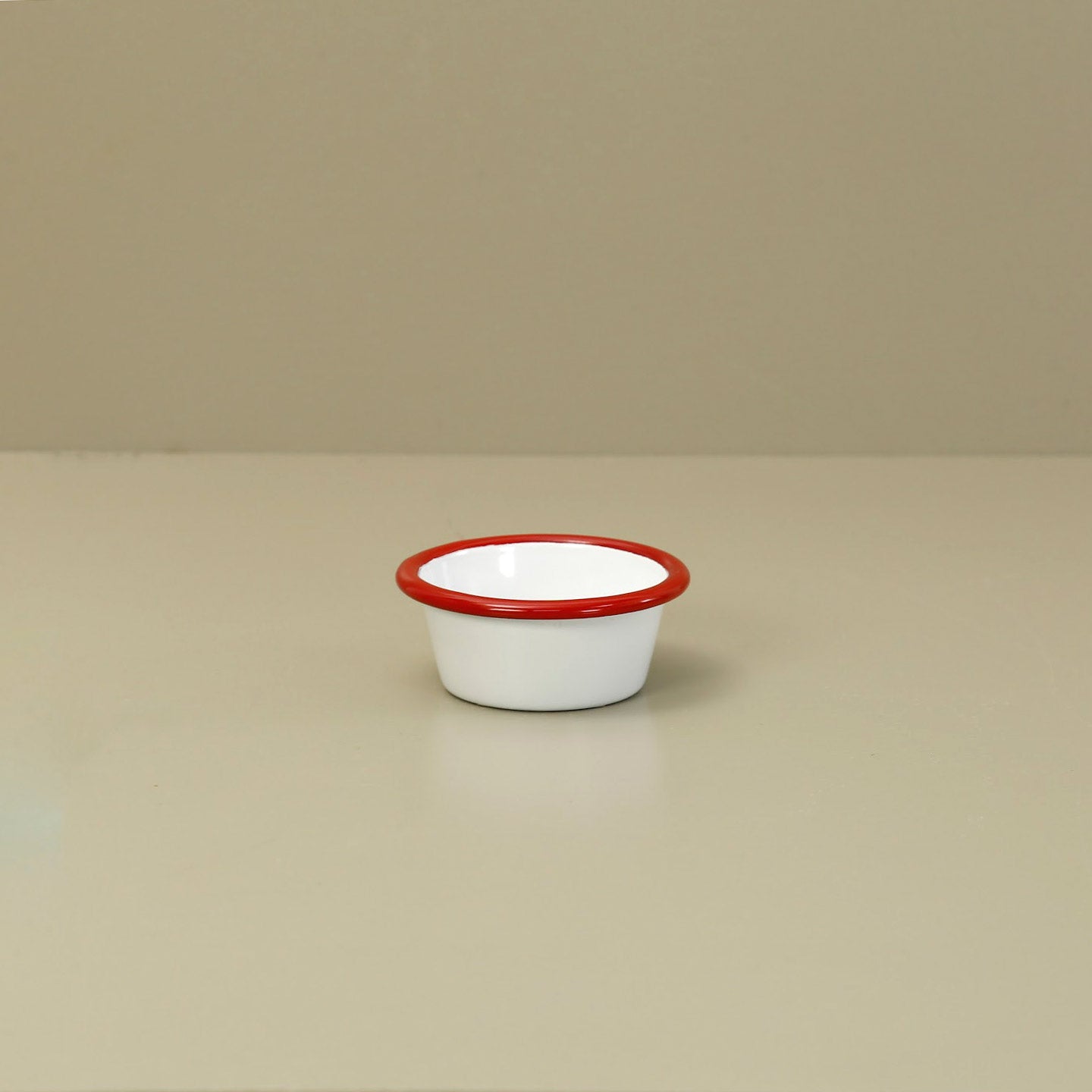 Red rim vintage-style enamelware in assorted styles for serving and baking.