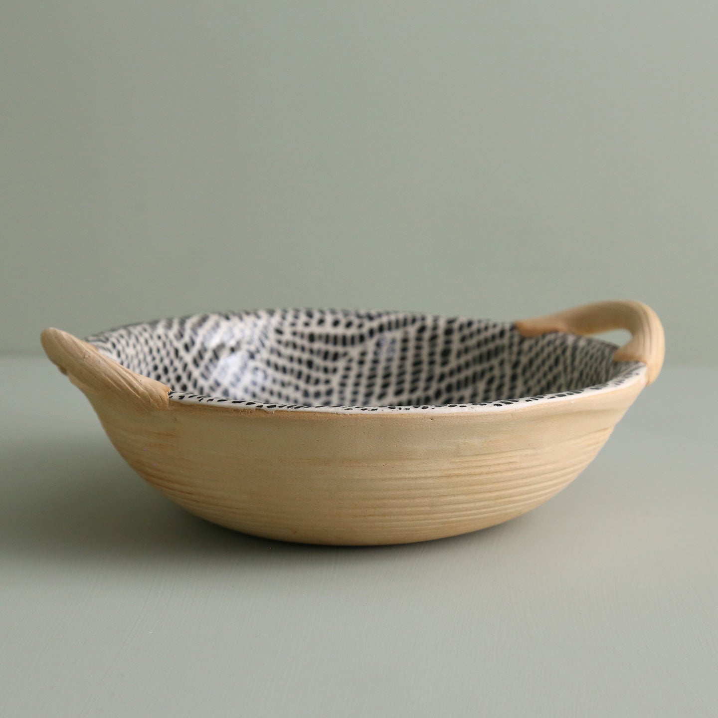 Handmade ceramic veggie bowl, with handles, made using a unique process of glazing over lace and materials to create gorgeous designs and texture. Each piece is signed and dated on the bottom.