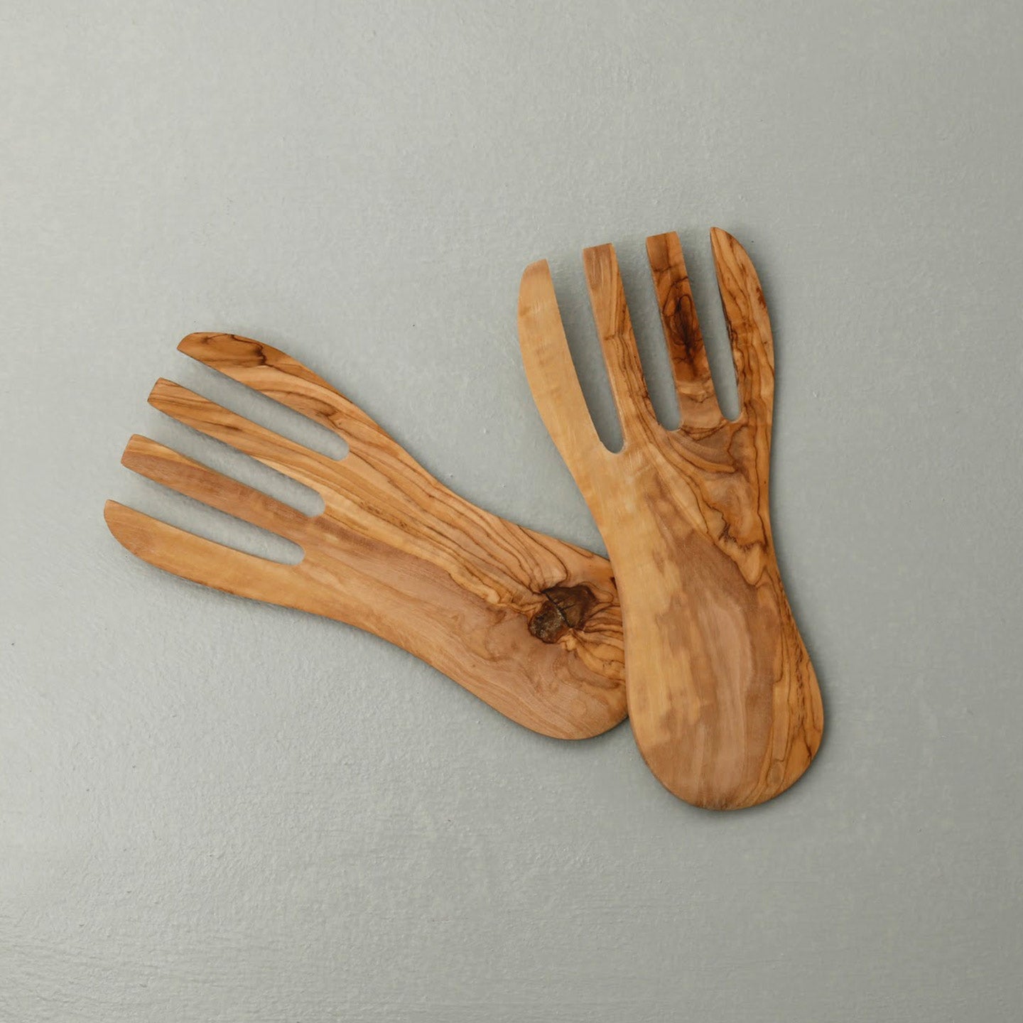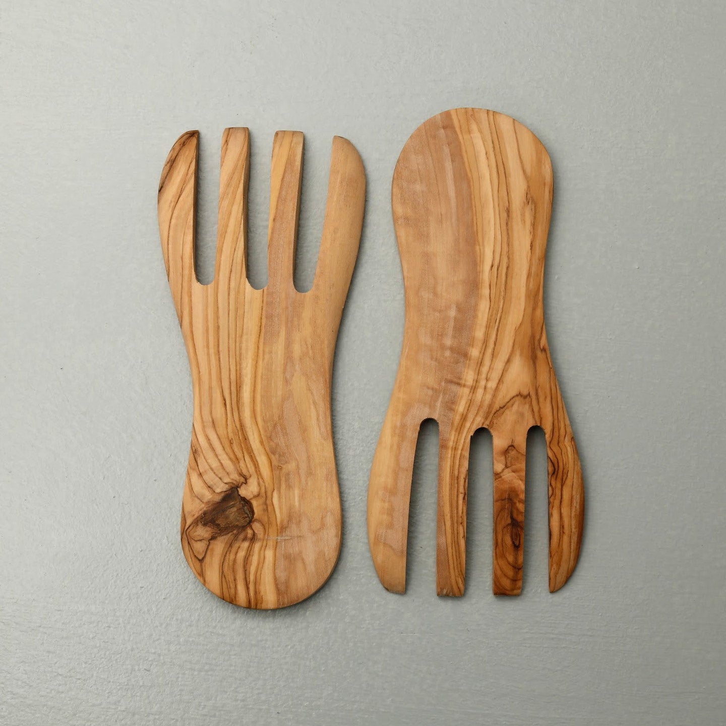 Gorgeous pair of olive wood flat forks for salad servings. Complete your culinary vision with beautiful details that elevate the experience. Olive wood utensils display the naturally wrought designs of the trees from which they were formed, grown in fertile soil over many years for an absolutely unique look that enhances every table. Food safe.
