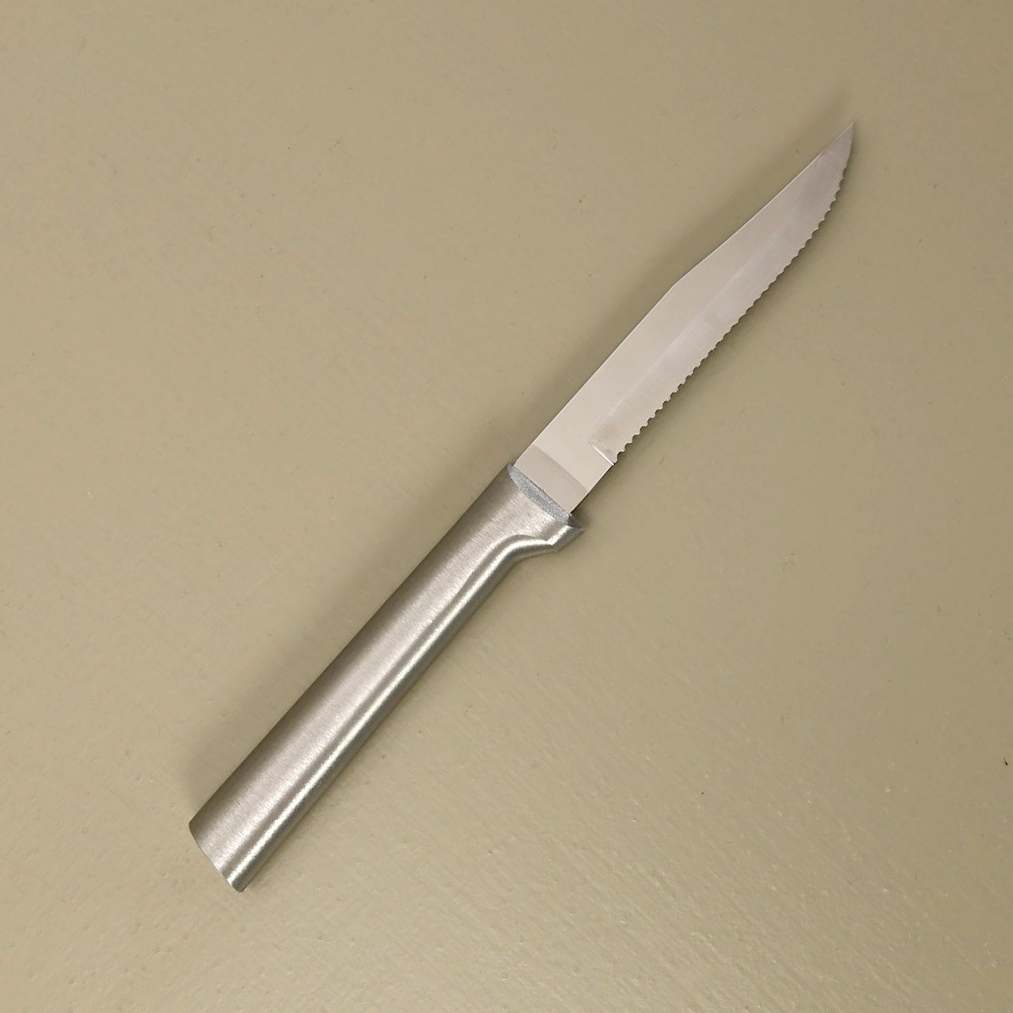 The serrated steak knife is one of Rada's most celebrated knives, so this silver handle set of four is wildly popular. Designed with small, sharp, single-sided serrations, these knives easily cut through just about anything you’ll be serving at your table. Handcrafted from surgical-quality, T420 high-carbon stainless steel for a lifetime of durability then hollow ground for incredible sharpness. The silver handles are constructed from permanently cast brushed aluminum for remarkable durability and a beautiful satin finish.