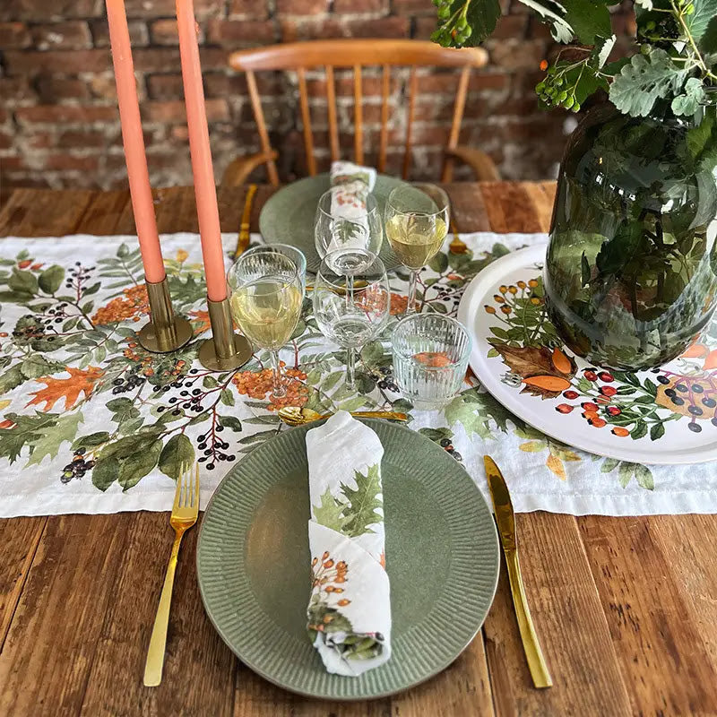 Made from 100% naturally grown linen, this runner offers timeless style and sustainability. Printed with environmentally friendly dyes, it ensures that the autumn colors remain vivid and long-lasting. The softness of the linen adds a touch of sophistication, making it ideal for both intimate gatherings and larger occasions.