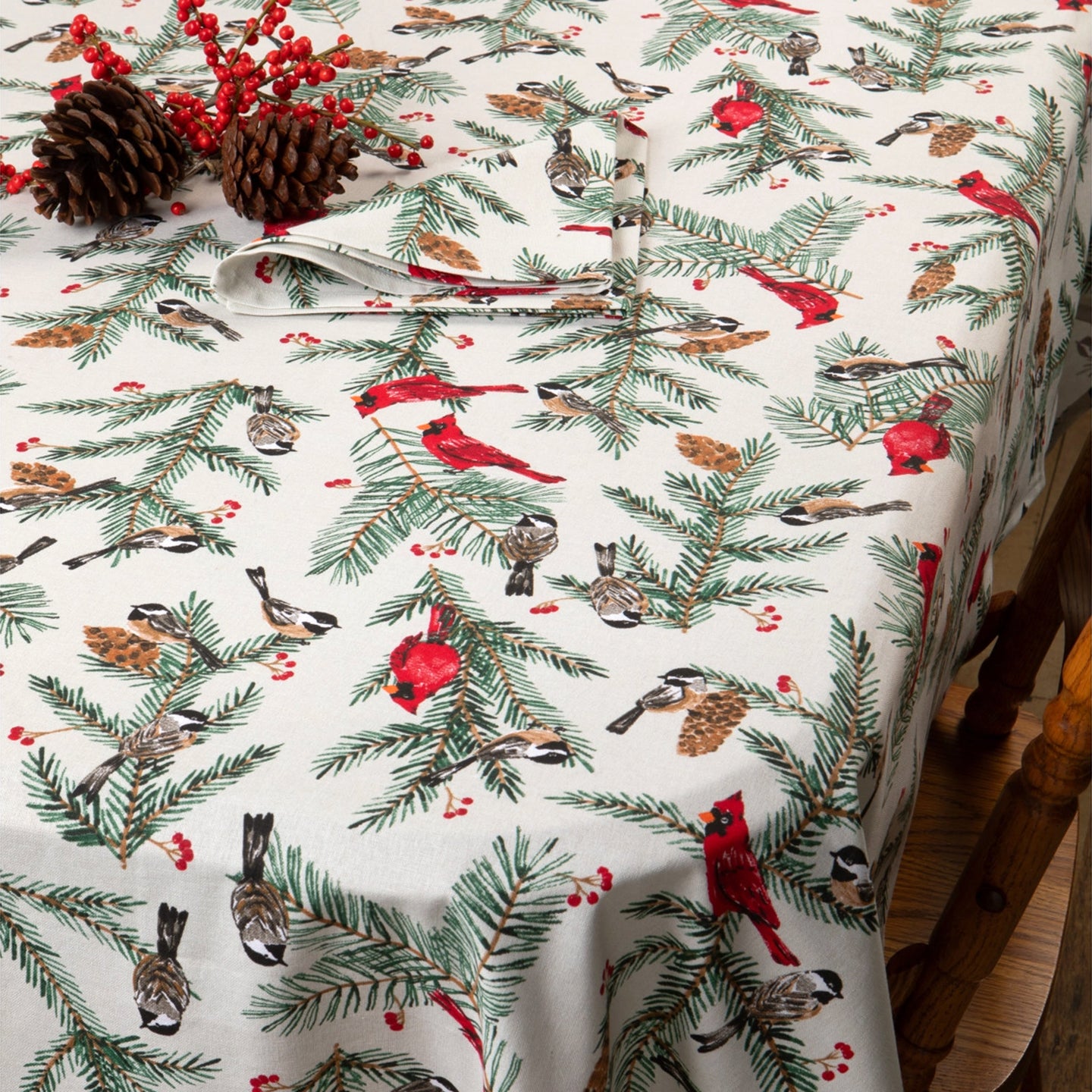 Set the table with the elegant Birds & Boughs woven 100% cotton tablecloth. It's perfect for hosting a dinner party or giving as a housewarming gift. Perched on berry-dappled boughs, cheerful chickadees and radiant red cardinals signal the arrival of winter’s natural wonders.