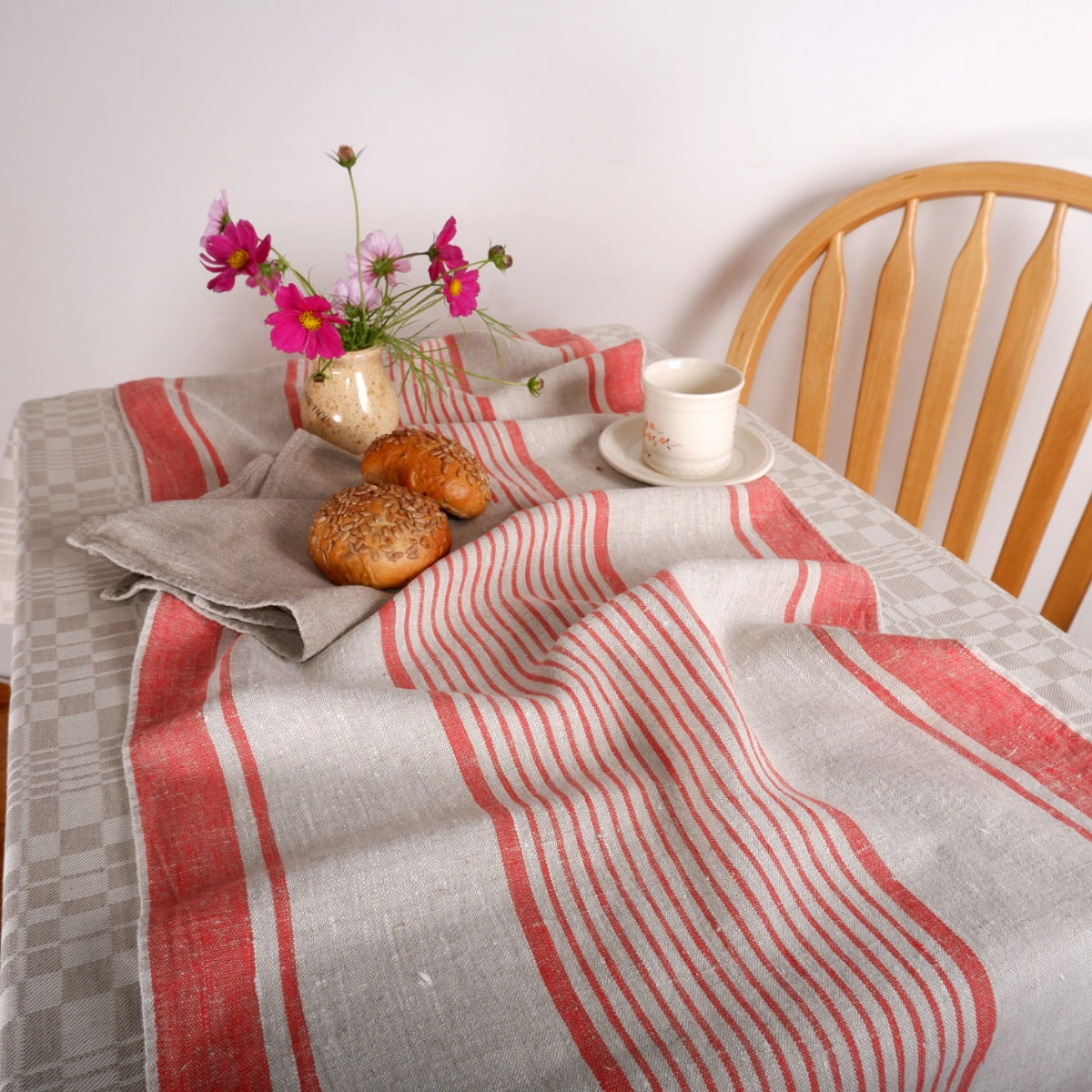 Elevate your dining table with this heavy linen striped table runner in elegant red tones. Made with high-quality fabric, it adds sophistication to any space. Durable for everyday use and special occasions, its luxurious weight provides a polished appearance.