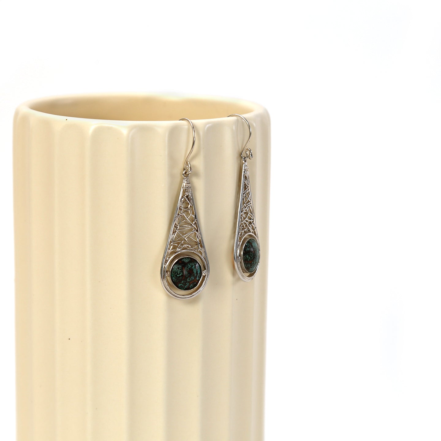 On one side of these two-in-one earrings, a triangle of tangled silver circles at the bottom around a blue moon of oxidized copper. On the other side, the copper is brightly hammered orange. To reverse the dangle, simply slip it off its ear wire, flip it over, and slip it back on.