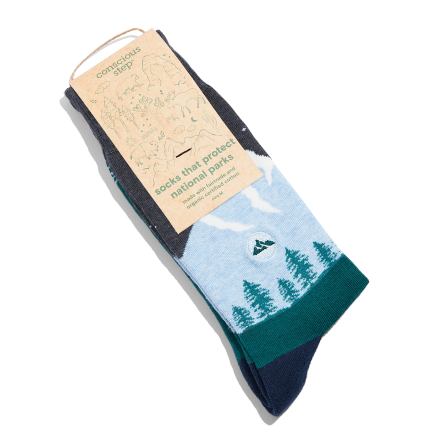 Why don’t mountains get cold in the winter? Because they wear snow caps! Keep your feet warm with their own snow-inspired caps in these green and blue mountainscape socks.