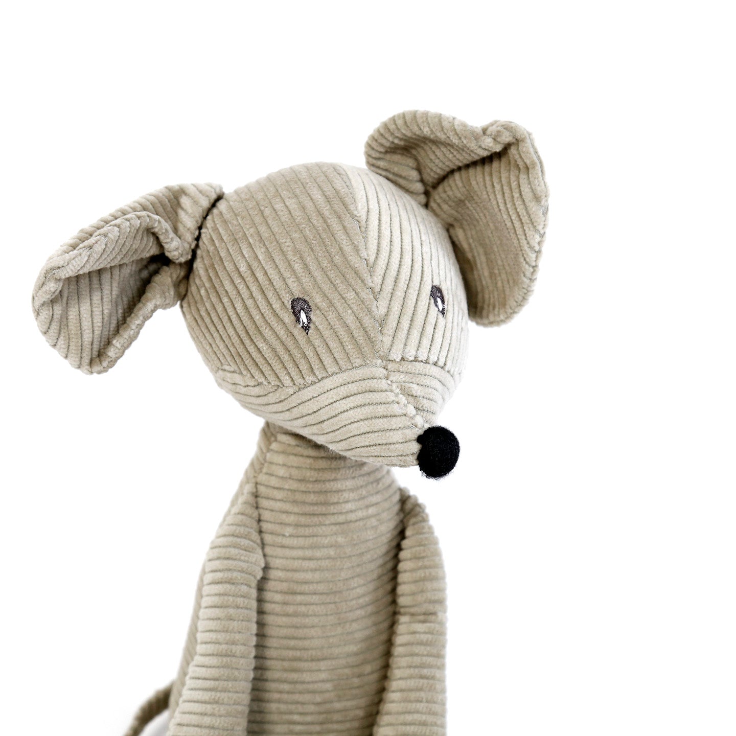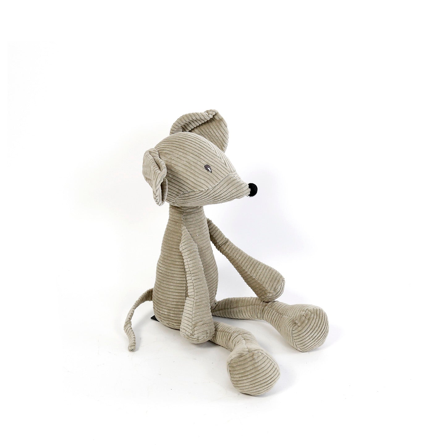 This charming mouse is crafted from cotton corduroy with a soft polyester filling. Its weighted base allows it to remain seated steadily on any shelf.