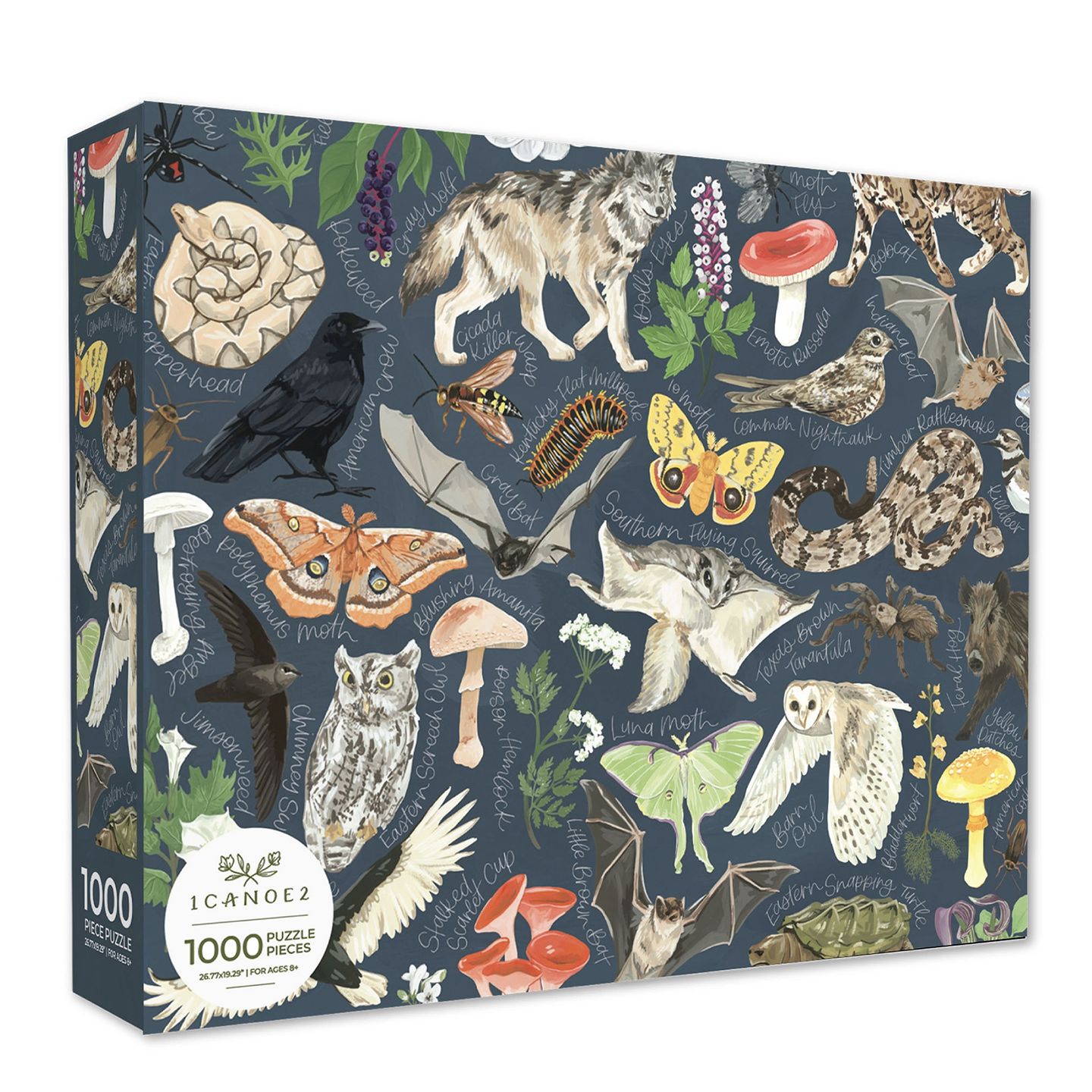 Discover the mysteries of the night with this hand-painted 1000-piece puzzle, featuring a richly detailed scene of nocturnal animals, moths, mushrooms, and midnight blooms. Perfect for puzzle lovers, nature enthusiasts, and anyone who enjoys a challenge, this puzzle brings the beauty of the natural world to your table. A thoughtful gift for wildlife or plant lovers or a cozy indoor activity to enjoy year-round.