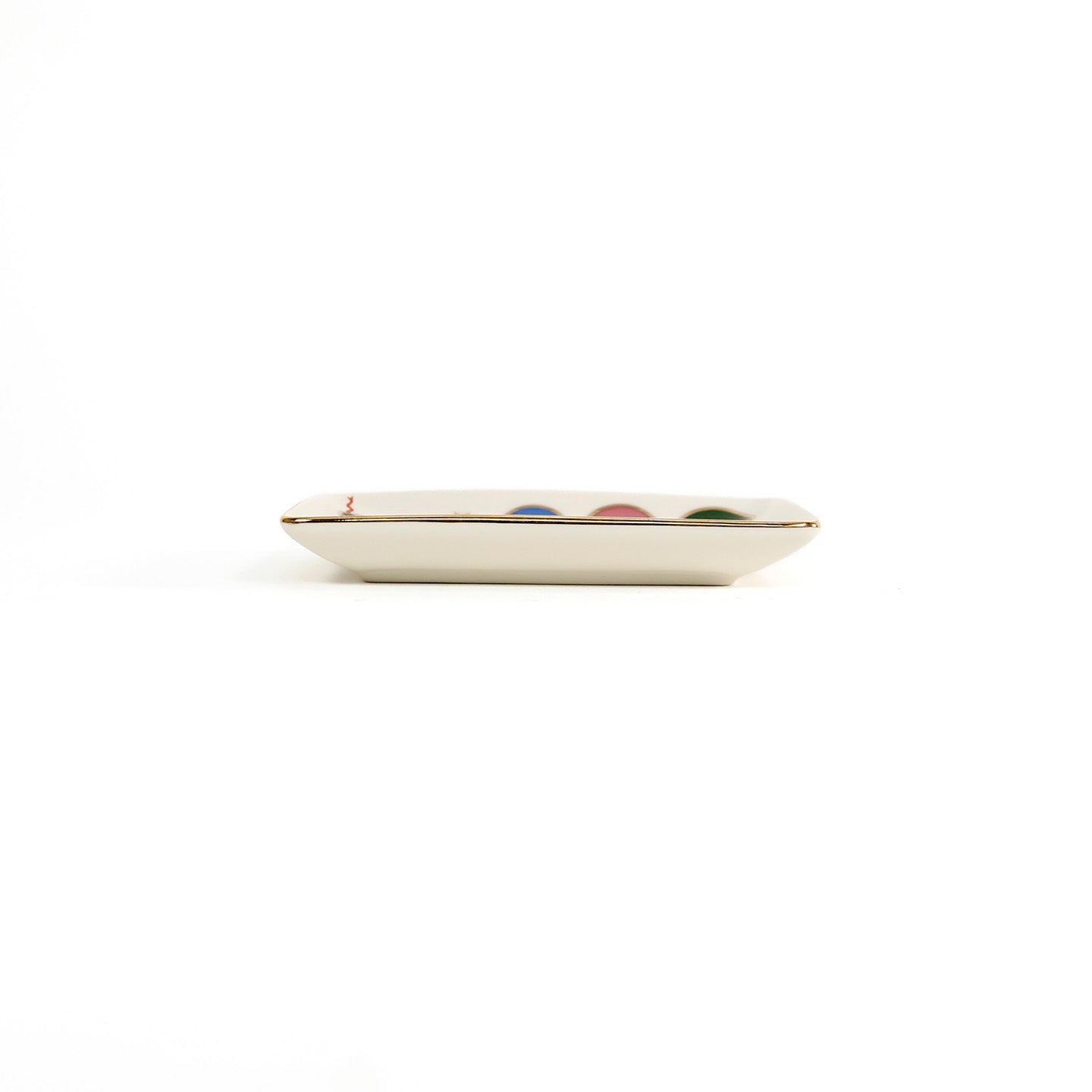 This ceramic trinket dish is the perfect catch-all for your nightstand or dresser. White ceramic is adorned with colorful, hand-painted designs and a lined edge in metallic 10k gold for added flair.