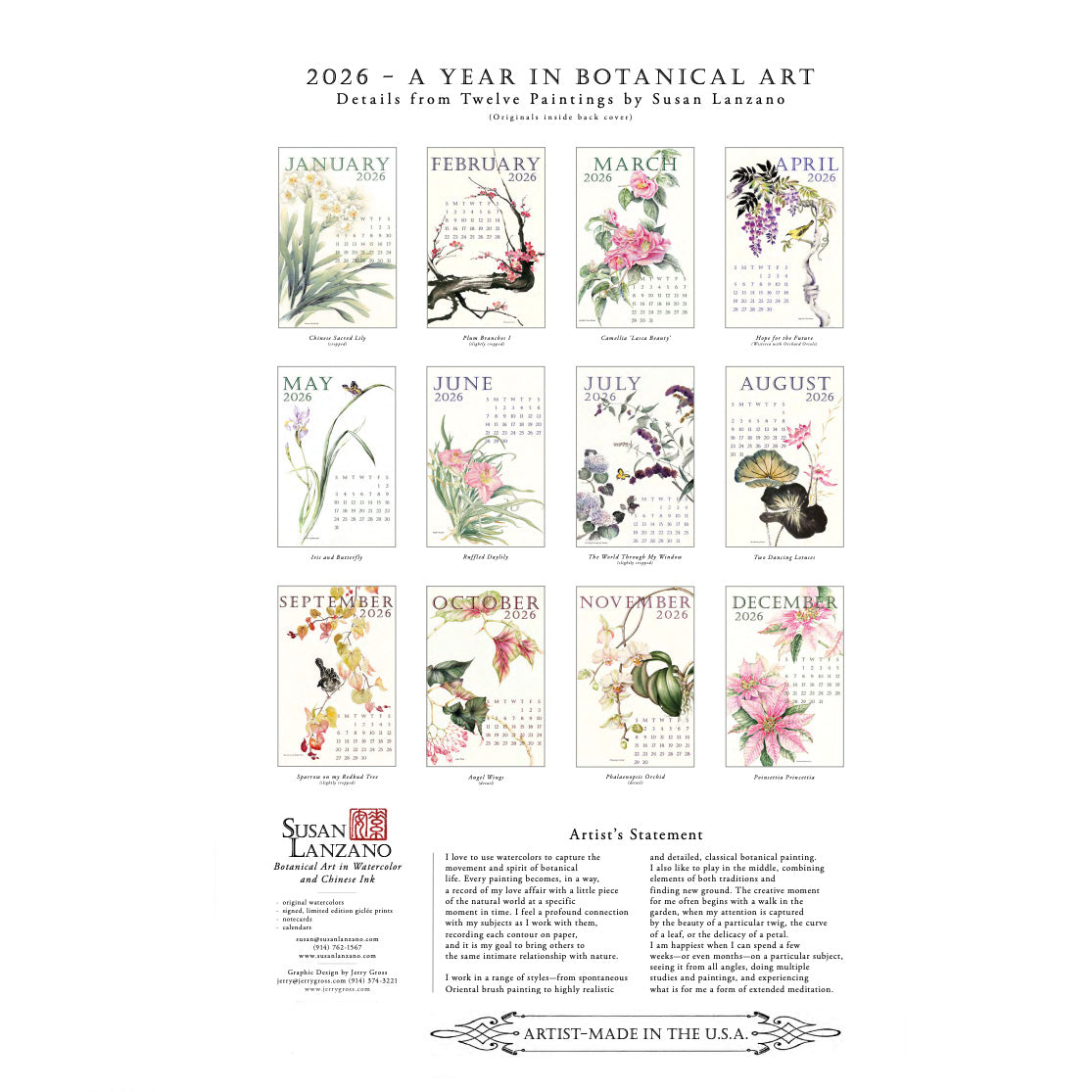 This 12-month calendar features stunning watercolor floral illustrations by renowned artist Susan Lanzano, making it a beloved customer favorite. Explore the beauty of botanical art through both watercolor and Chinese ink techniques, showcasing the mastery and originality of Susan's work.