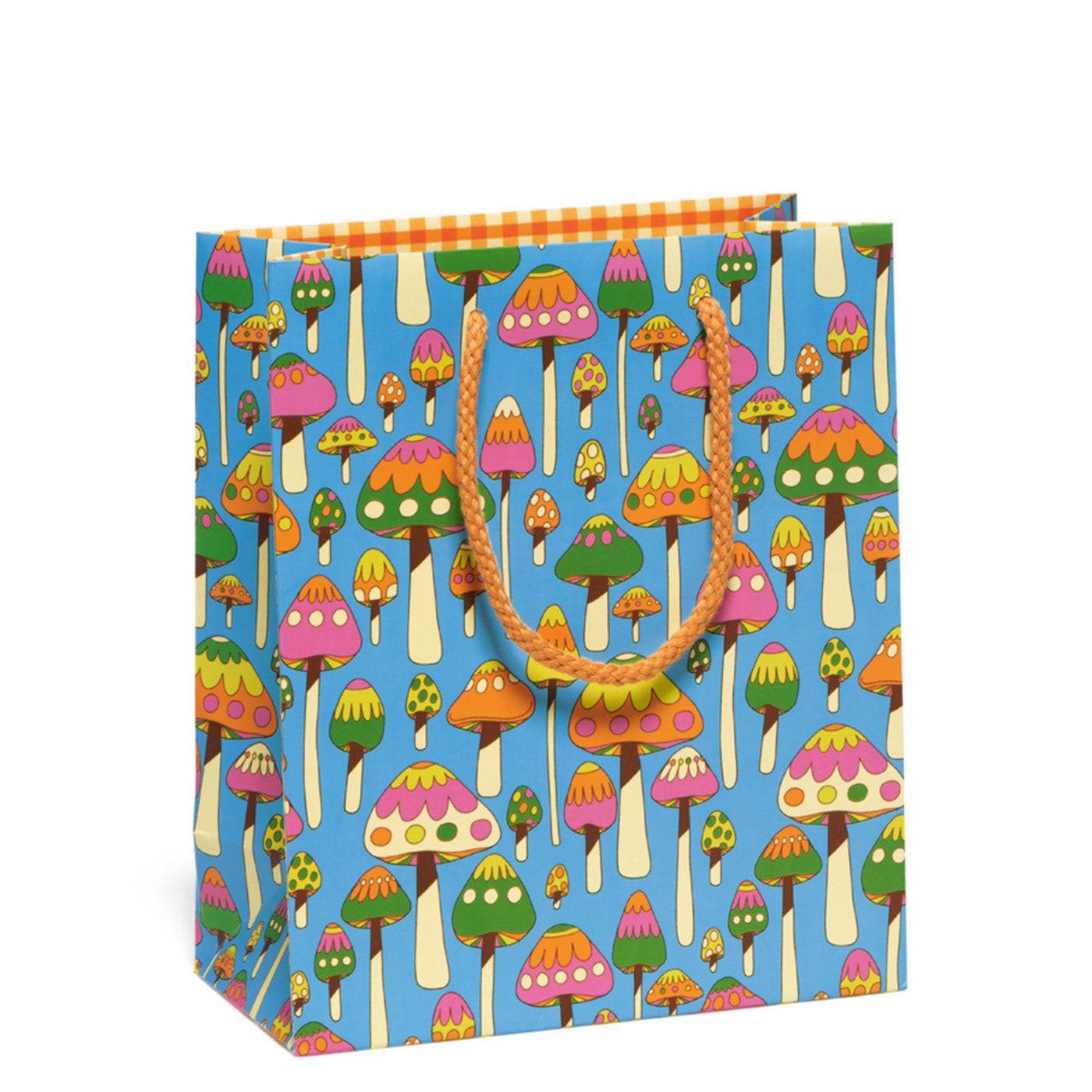 This unique gift bag showcases vibrant colors and features a variety of mushroom illustrations.