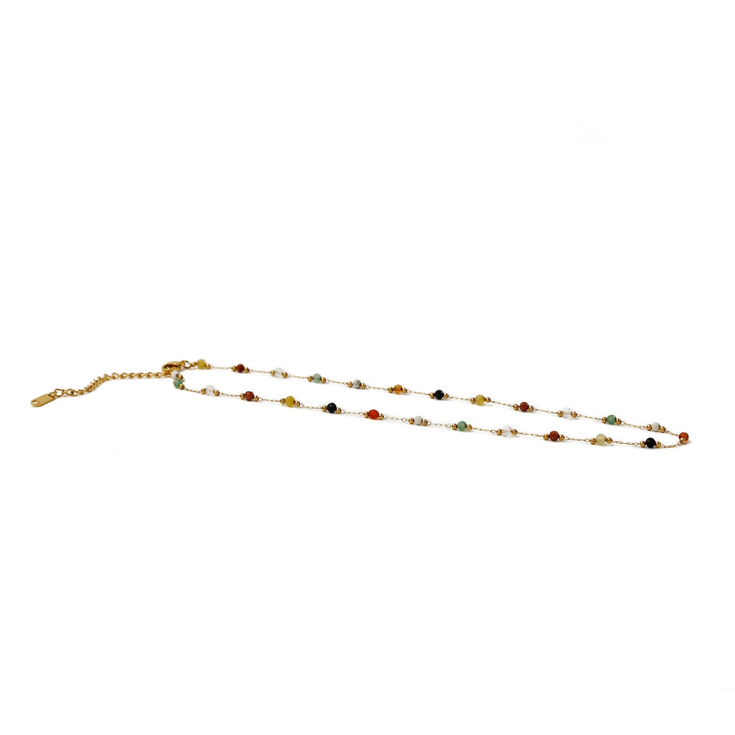 18K Gold Plating on stainless steel for durability and elegance. It is generally waterproof and can resist tarnishing for up to a year with regular wear. Multi-color agate stones.
