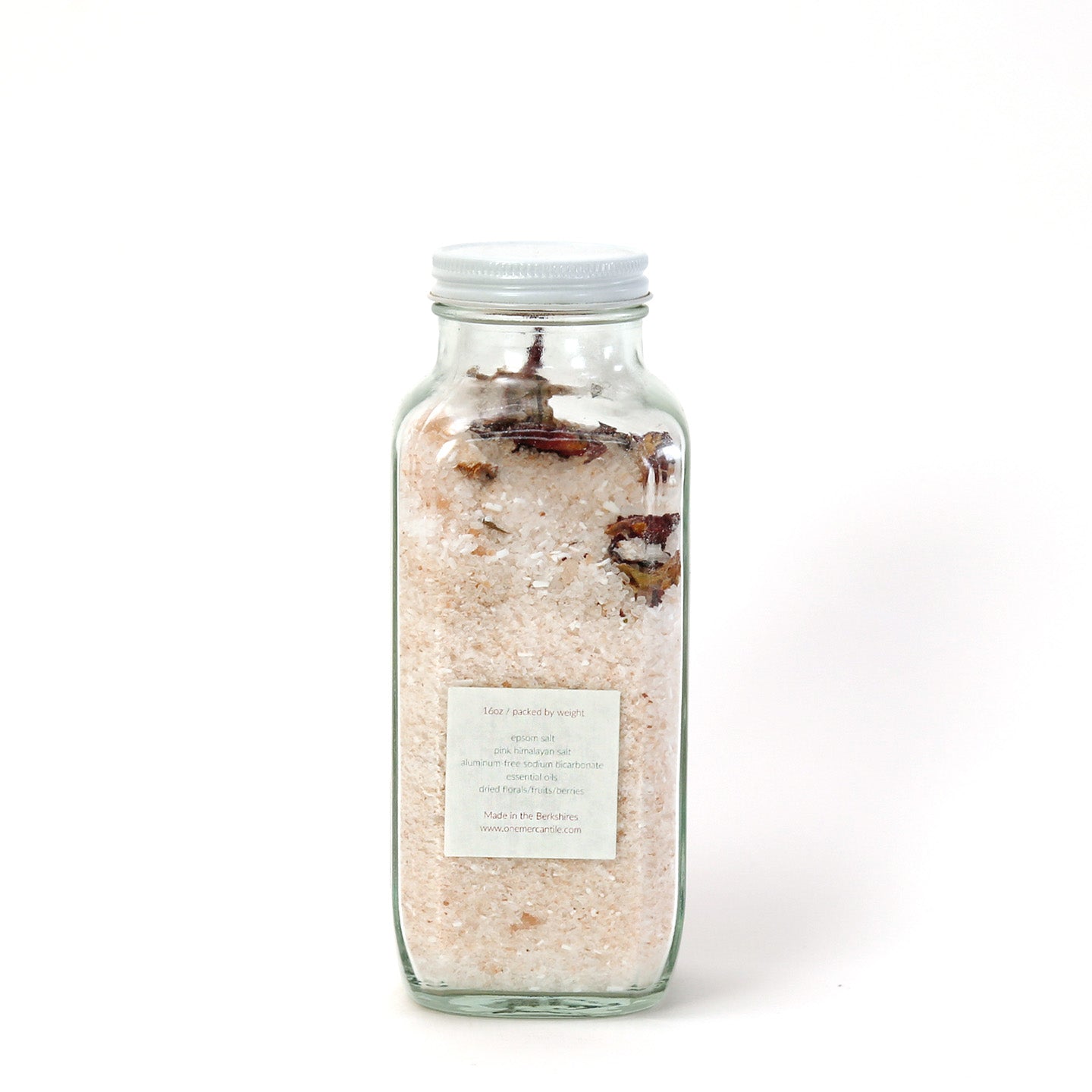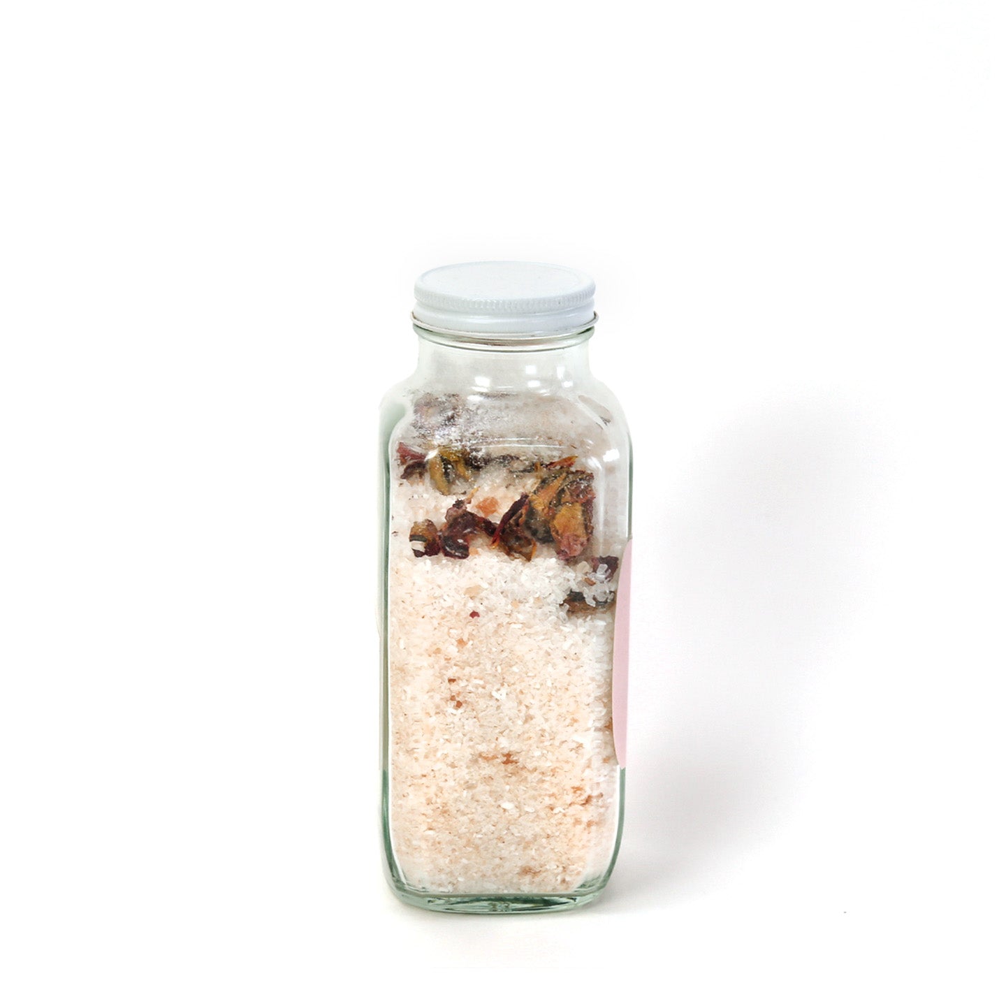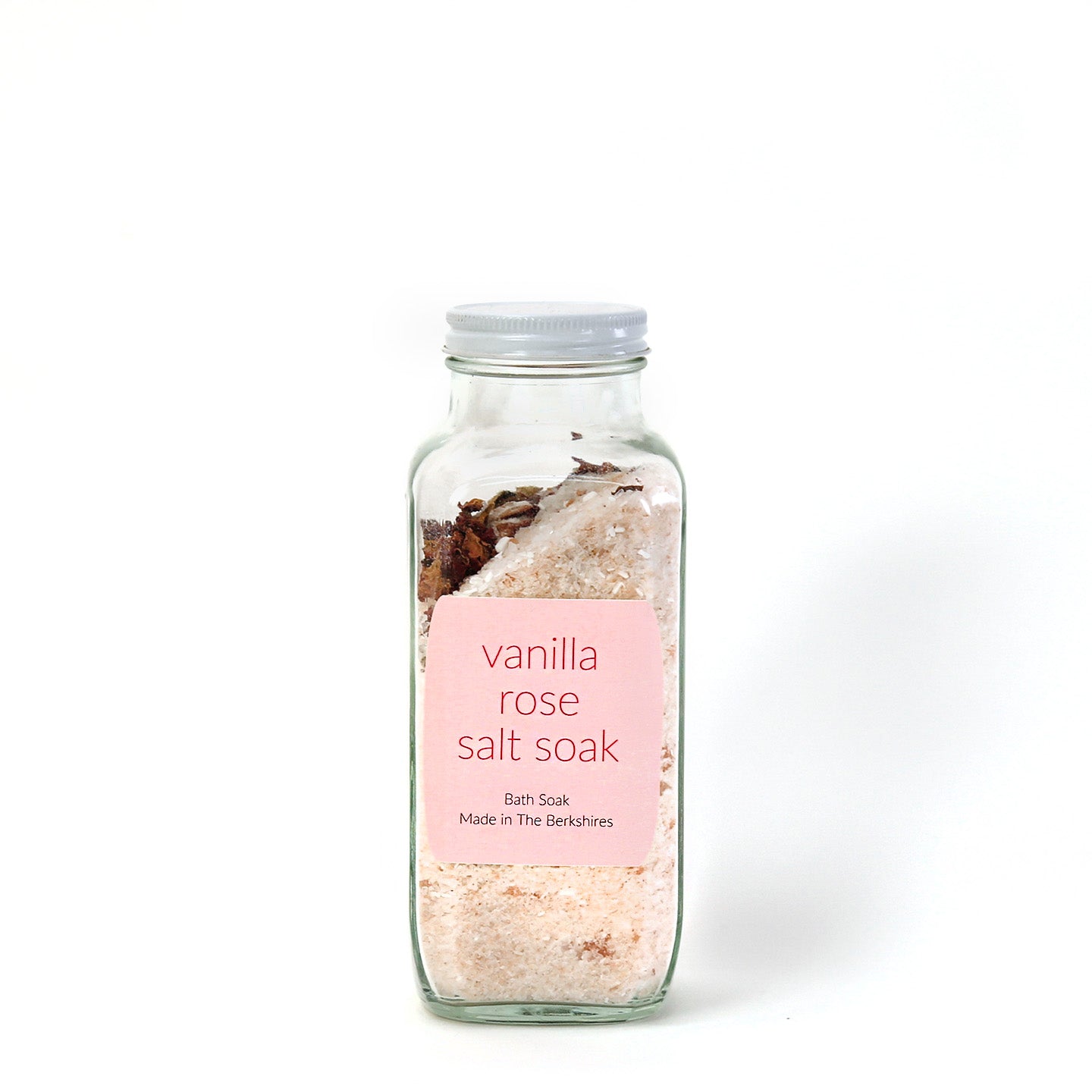 INGREDIENTS: Vanilla & Rose essential oils blended with pink Himalayan salt, Epsom salt, sodium bicarbonate (aluminum-free baking soda), and dried rose petals. Packaged in an eco-re-usable bottle!