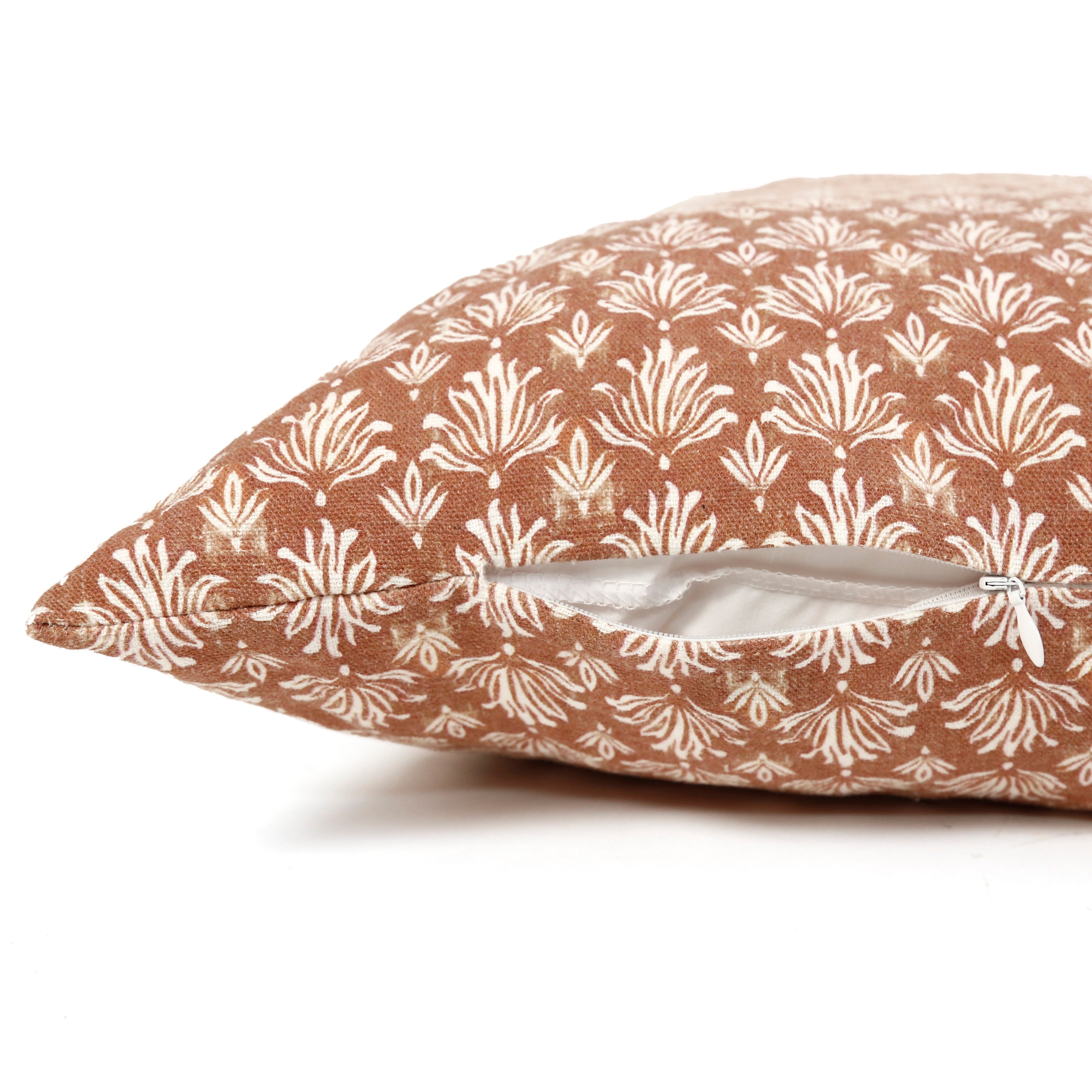 A sophisticated linen pillow with block print that adds an elegant touch to any space. This pillow features a beautiful floral block-printed design and lends a chic farmhouse vibe. Features surged edges and a hidden zipper.