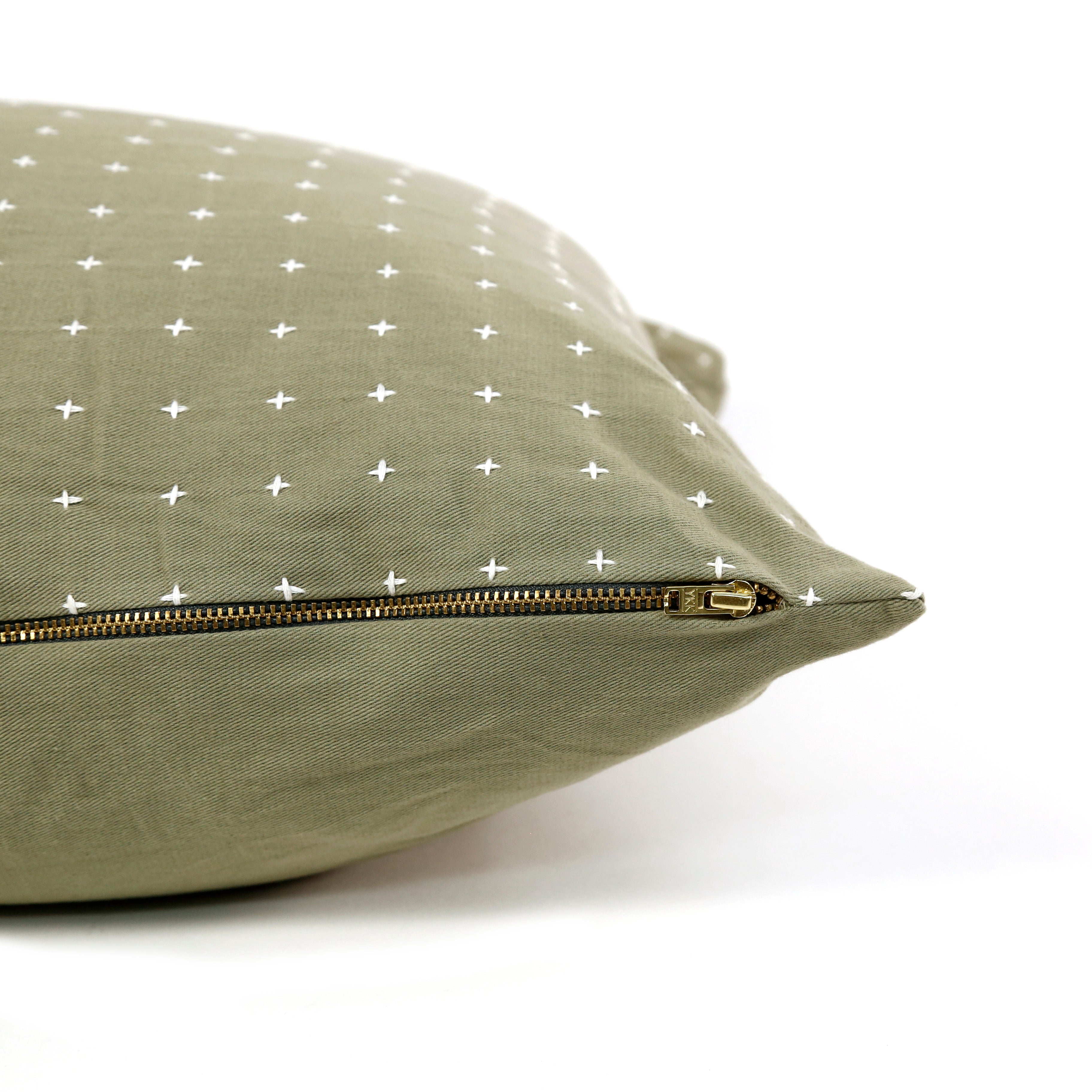 A minimalist cross-stitch pattern adds playful texture to this hand-embroidered throw pillow. Effortlessly add modern dimension to your home decor with this versatile and charming organic cotton pillow. This decorative pillow is available in a variety beautiful hues.