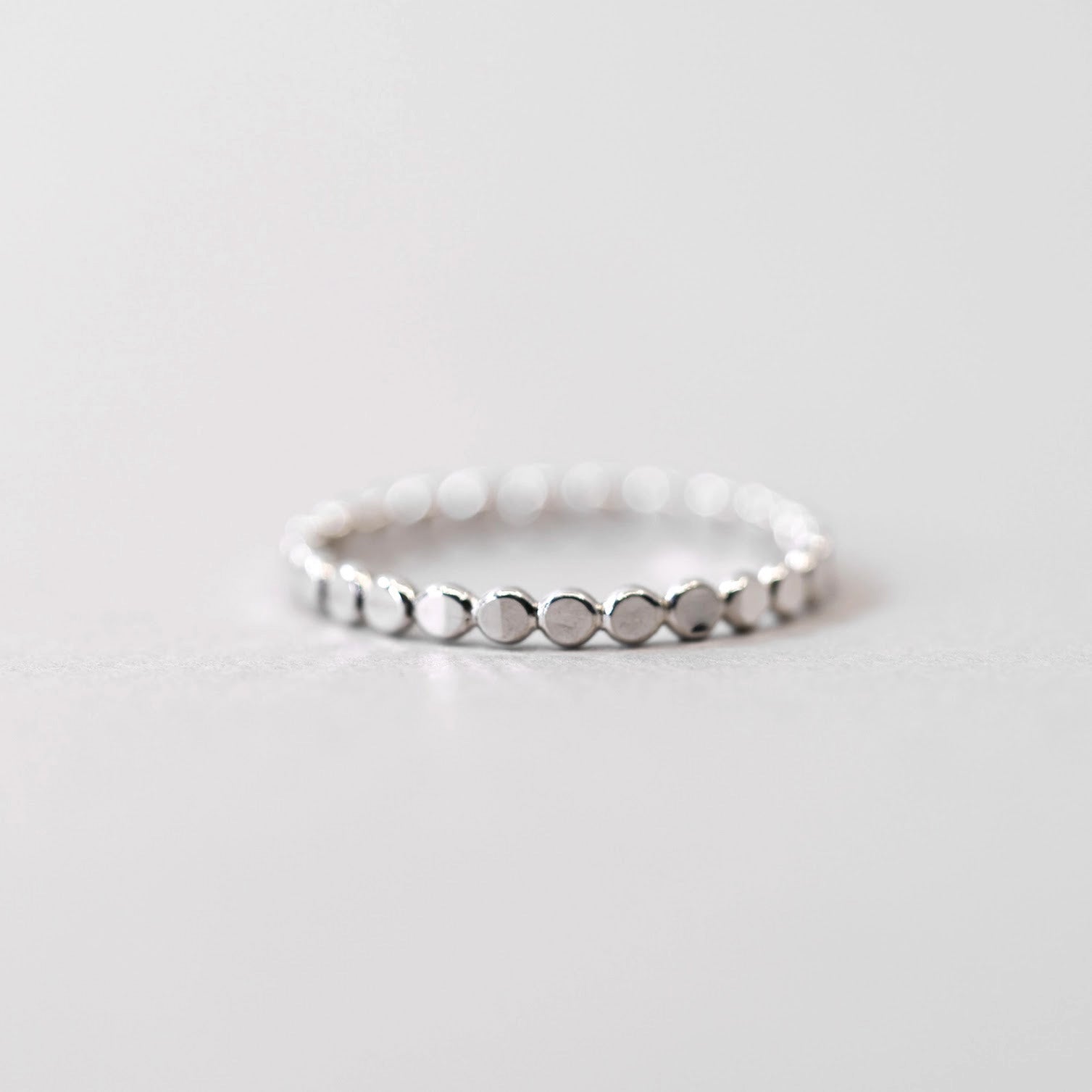 This ring features a dainty sterling silver band with hammered discs that cast just the right sparkle. Wear it alone or stack it with other rings.