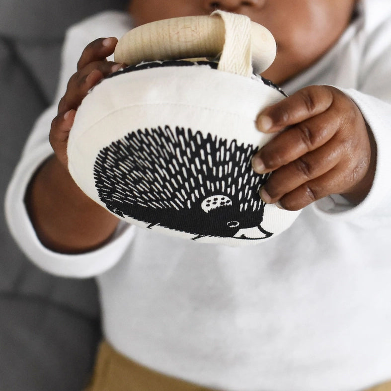Sustainably made teether, sized perfectly for tiny hands, with Wee Gallery's signature high-contrast illustrations, 100% organic cotton fill and outer shell, and an eco-certified maple wood teething ring. This teether are lightweight for babies while providing a substantial grip with both the maple wood ring and the natural texture of the organic cotton. Multiple textures provide ideal teething surfaces and grabby stimulation for your baby.