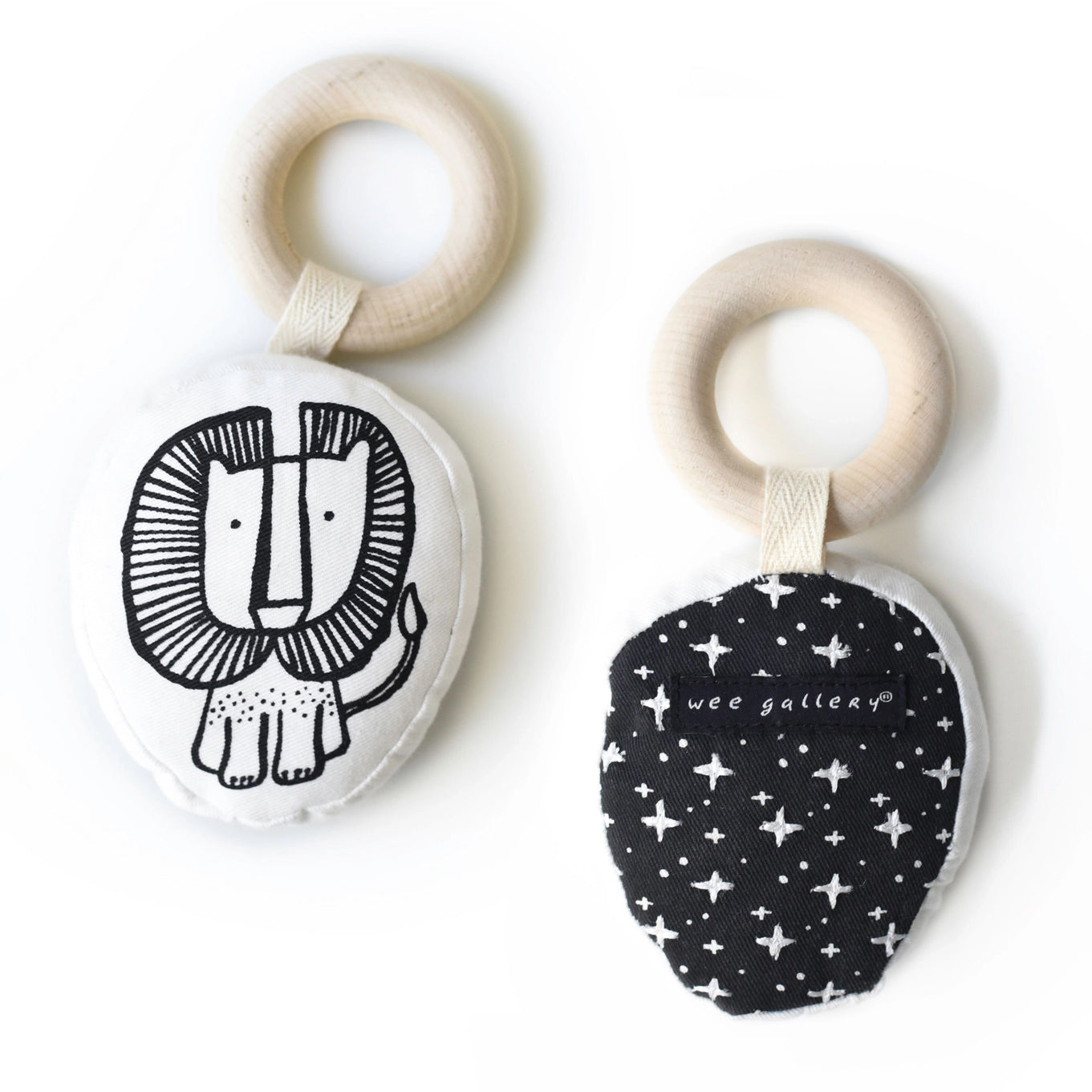 Sustainably made teether, sized perfectly for tiny hands, with Wee Gallery's signature high-contrast illustrations, 100% organic cotton fill and outer shell, and an eco-certified maple wood teething ring. This teether is lightweight for babies, while providing a substantial grip with both the maple wood ring and the natural texture of the organic cotton. Multiple textures provide ideal teething surfaces and grabby stimulation for your baby.