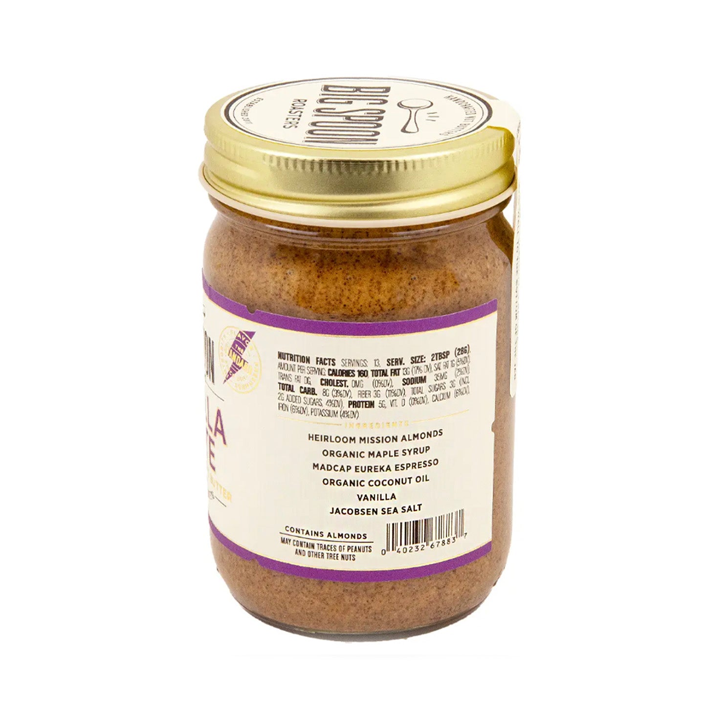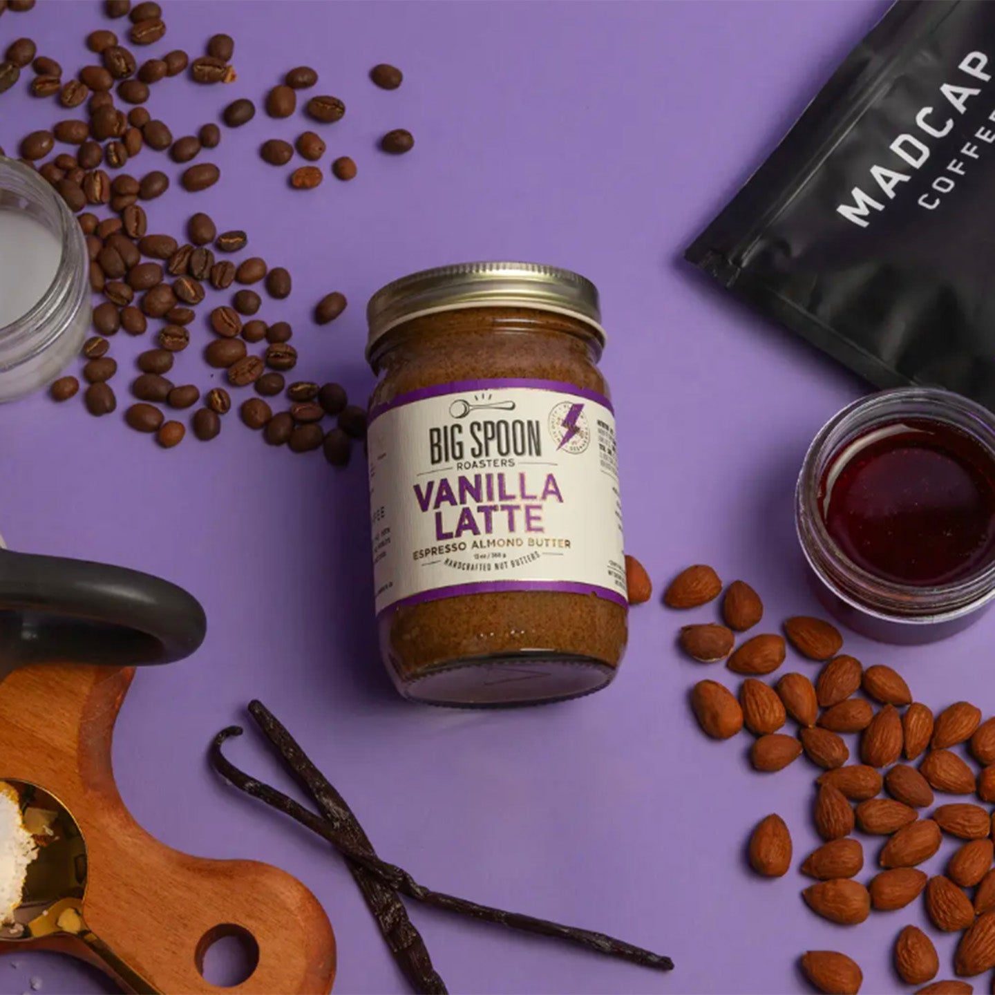 Big Spoon's go-to coffee order got a makeover in our new espresso nut butter collaboration with Michigan-based Madcap Coffee! Vanilla Latte Almond Butter emulates the smooth, comforting layers of espresso, your favorite milk, and vanilla, made spreadable. The base of heirloom Mission almonds is accented with the sweetness of Organic maple syrup and Ugandan Bourbon vanilla that round out the boldness of Madcap’s flagship Eureka Espresso, balanced by touches of Organic virgin coconut oil and Jacobsen sea salt.