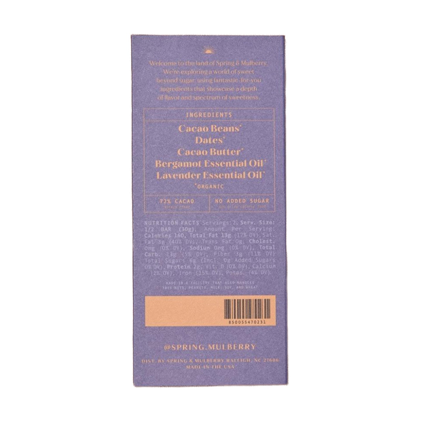 Ingredients: Organic Suhum Cacao Beans (Direct-Trade), Organic Dates, Organic Cacao Butter, Organic Bergamot Essential Oil, Organic Lavender Essential Oil