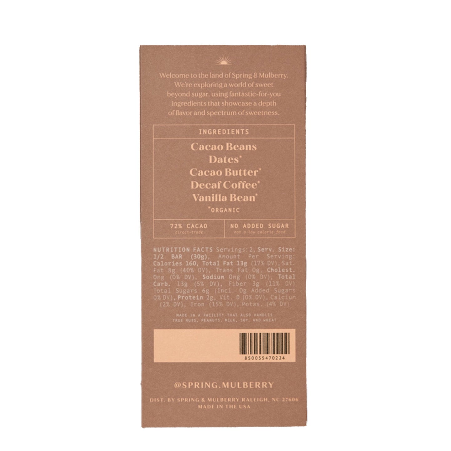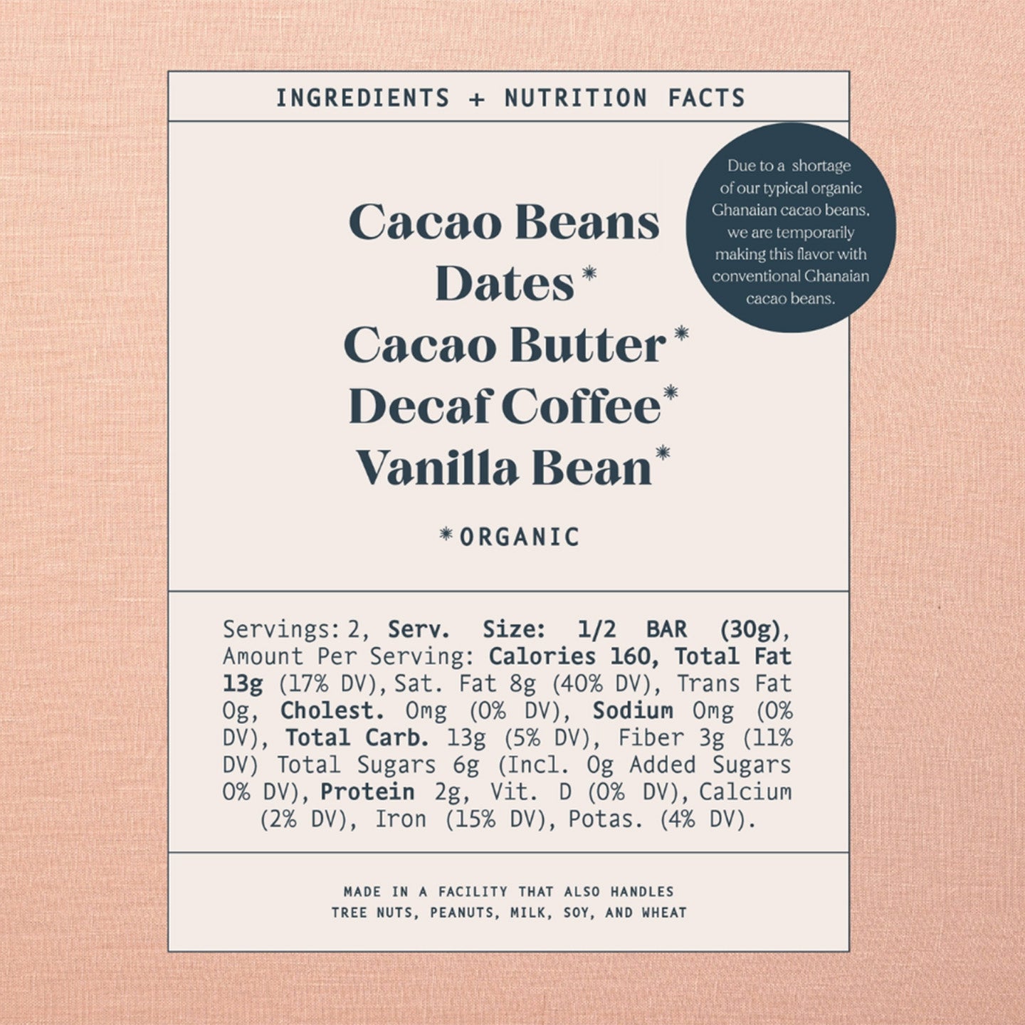 Ingredients: Organic Suhum Cacao Beans (Direct-Trade), Organic Dates, Organic Cacao Butter, Organic Decaf Coffee Beans, Organic Vanilla Bean