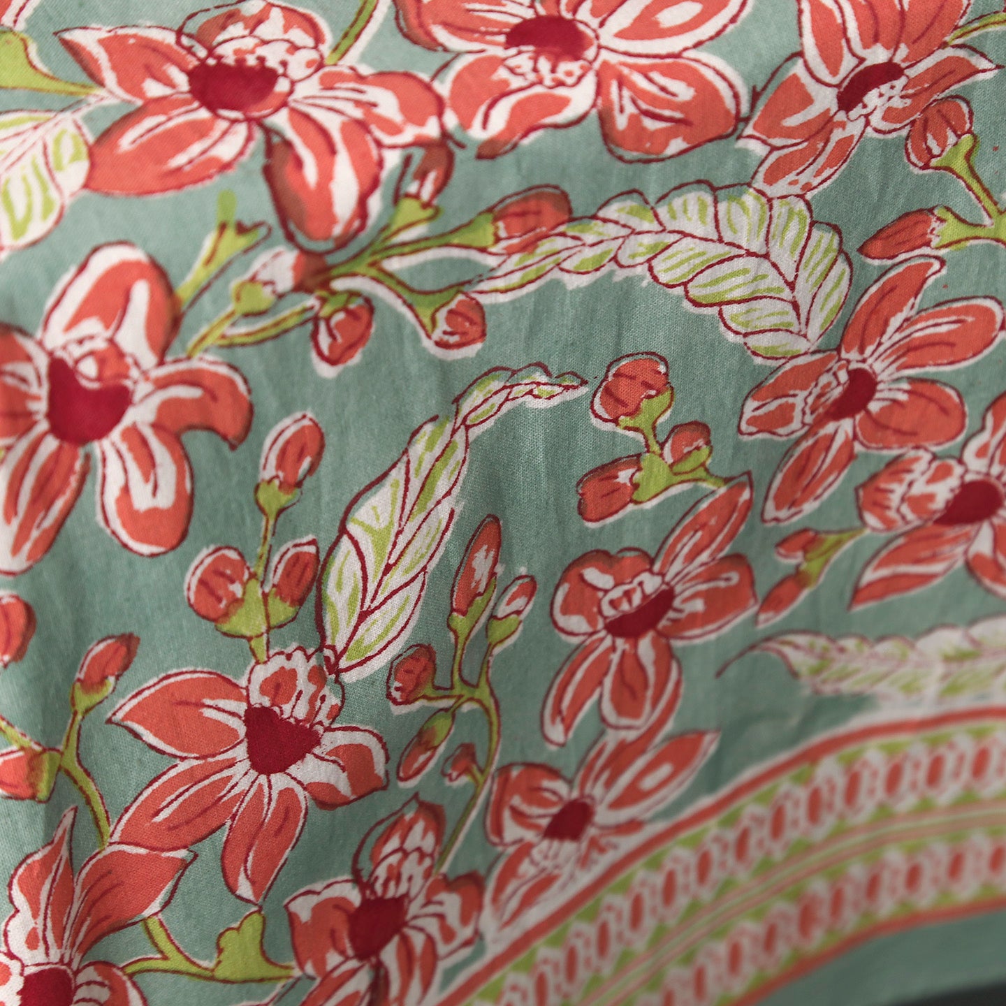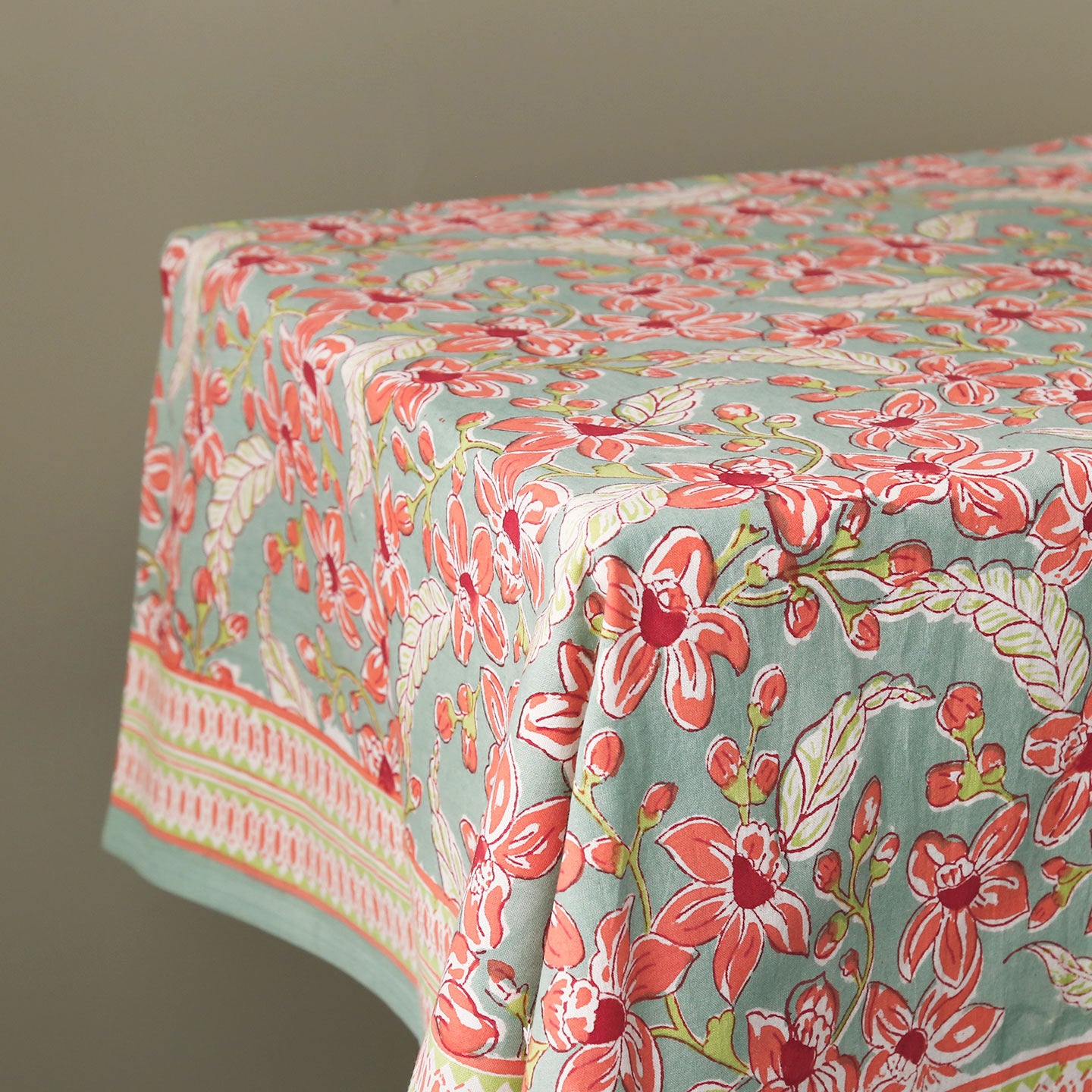 Cotton fabric tablecloths featuring a block-printed frangipani floral pattern.