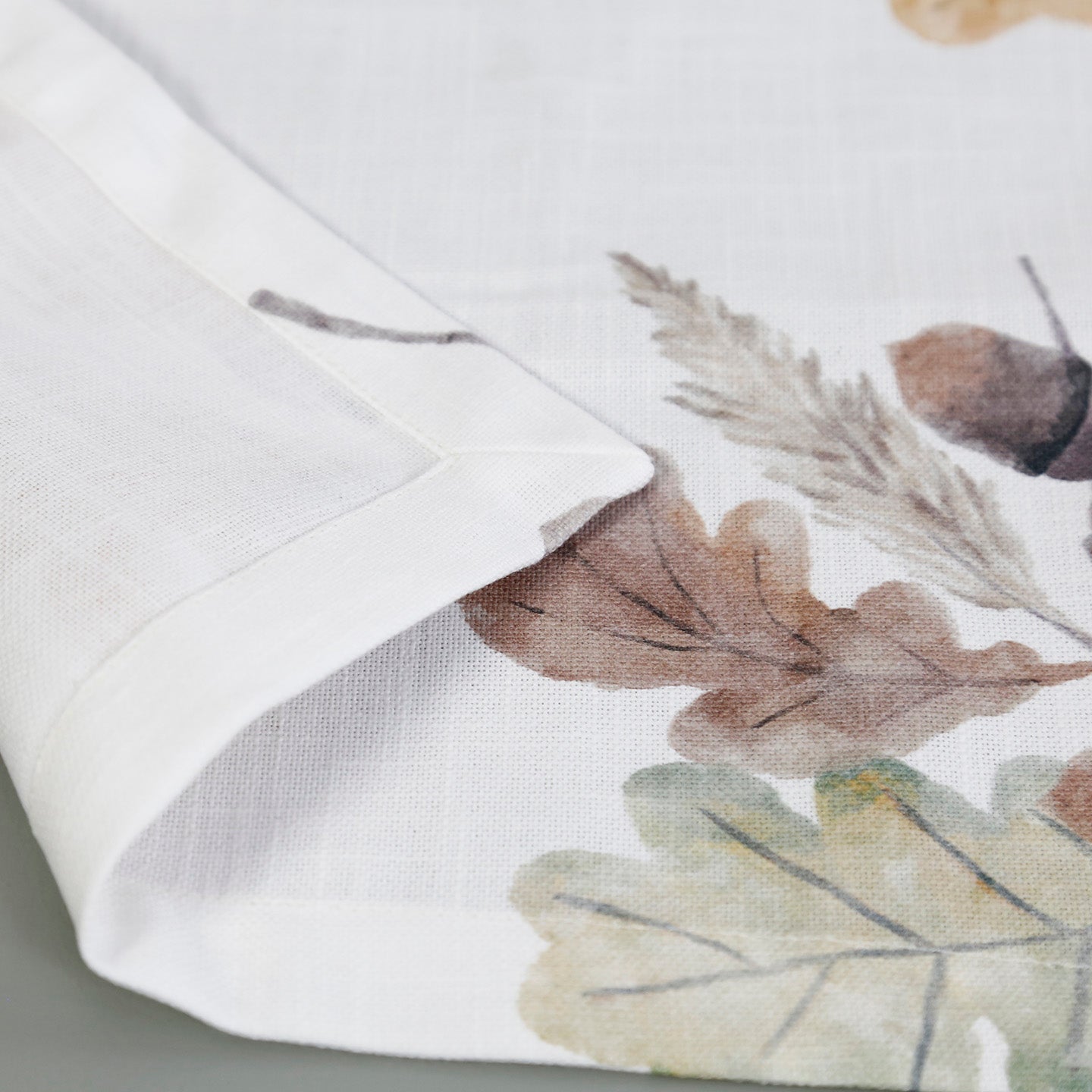 Create a stunning autumn centerpiece with this cotton table runner. Featuring a charming watercolor design of acorns and oak leaves against a soft off-white ground, it offers ample space to showcase your fall decorations. Combining durability with delicate artistry, this runner brings a warm, inviting touch to any fall inspired table.