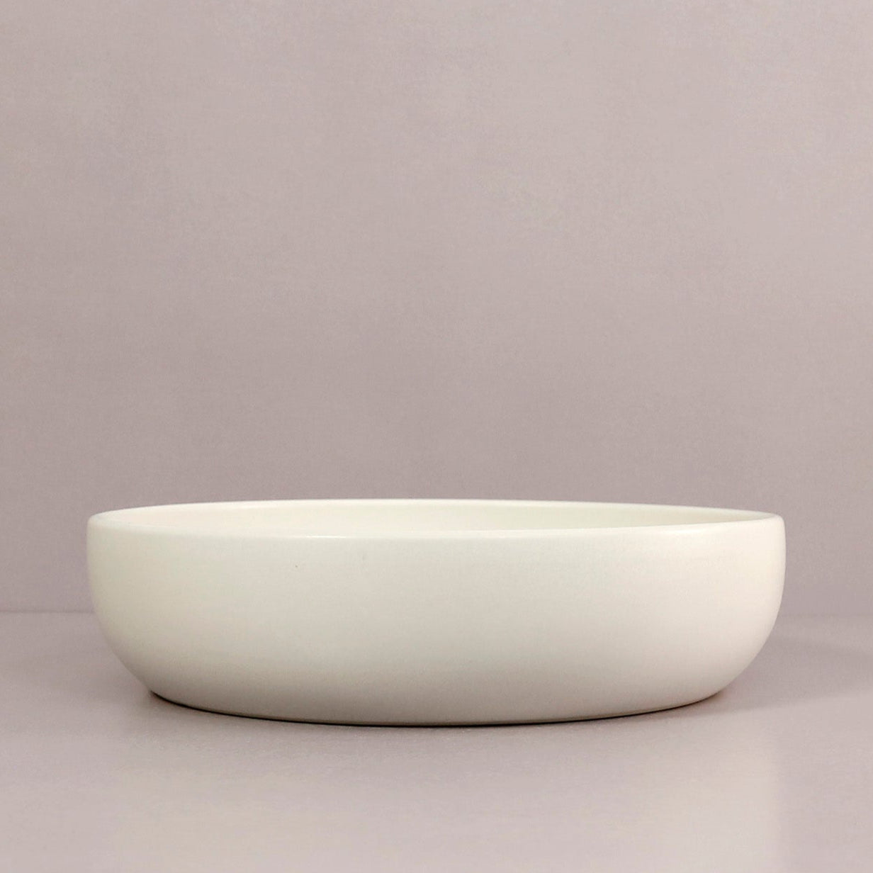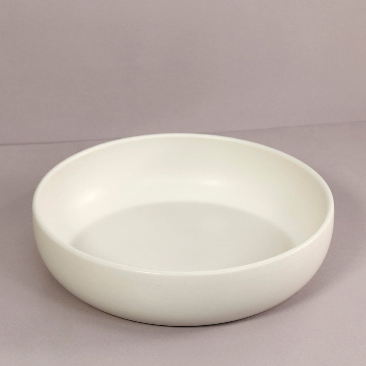 This handmade serving bowl provides a unique modern shape. It is shallow, minimal and so chic, perfect for effortless and elegant dining. It is offered in matte for rustic beauty and interior glazed to minimize cutlery marks. Made of enameled stoneware and completely free of heavy toxic metals.