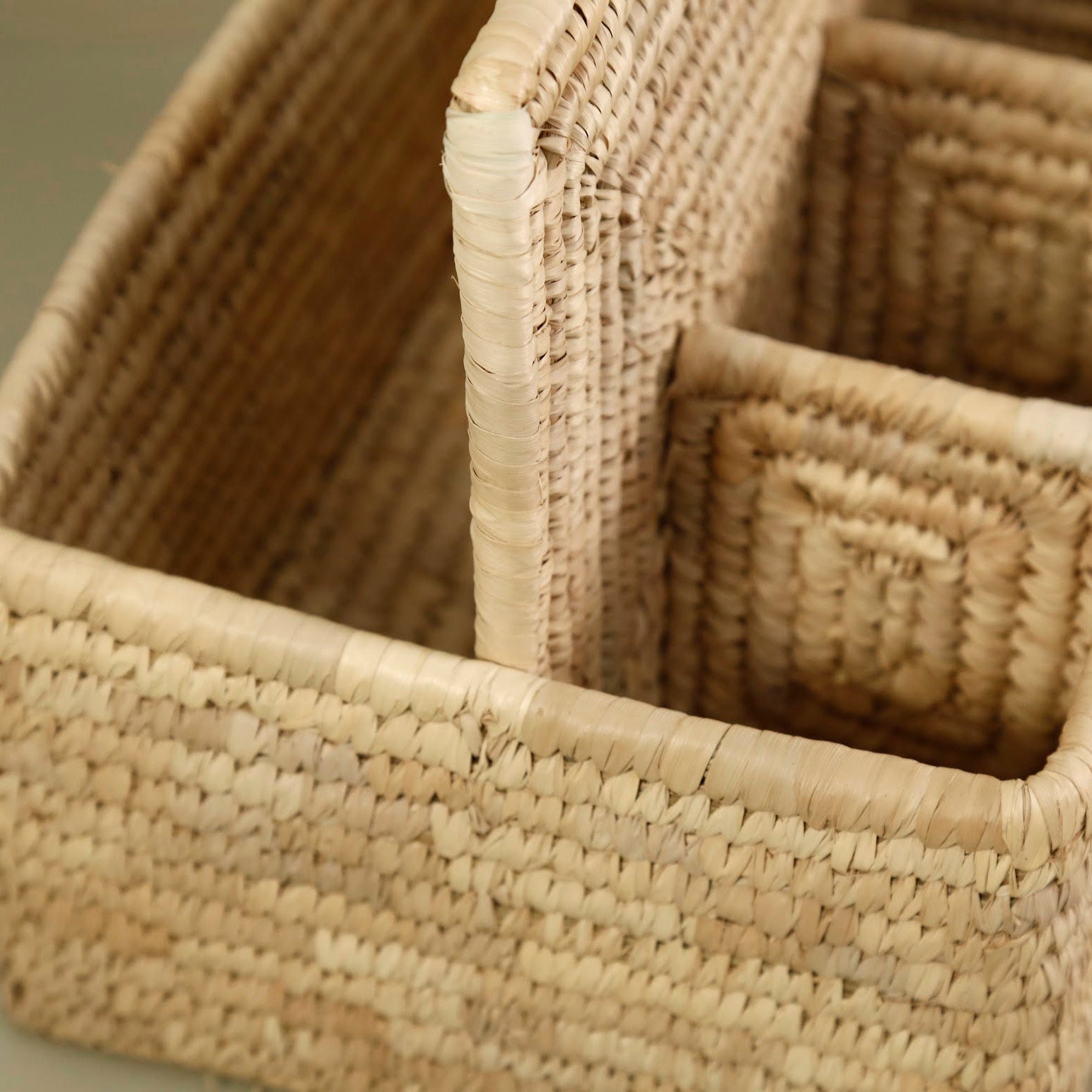 Tidy up your kitchen or tabletop with this handcrafted utensil holder made from sustainable date palm leaves and sturdy kaisa grass. Designed with function and form in mind, it features three square compartments perfect for forks, spoons or small tools and one longer section ideal for spatulas, serving utensils or napkins. A tall center handle makes it easy to carry from counter to table. The natural tones and organic texture add warmth and charm to any space, creating a piece that's practical and beautiful. Woven by skilled artisans using traditional techniques passed down through generations.