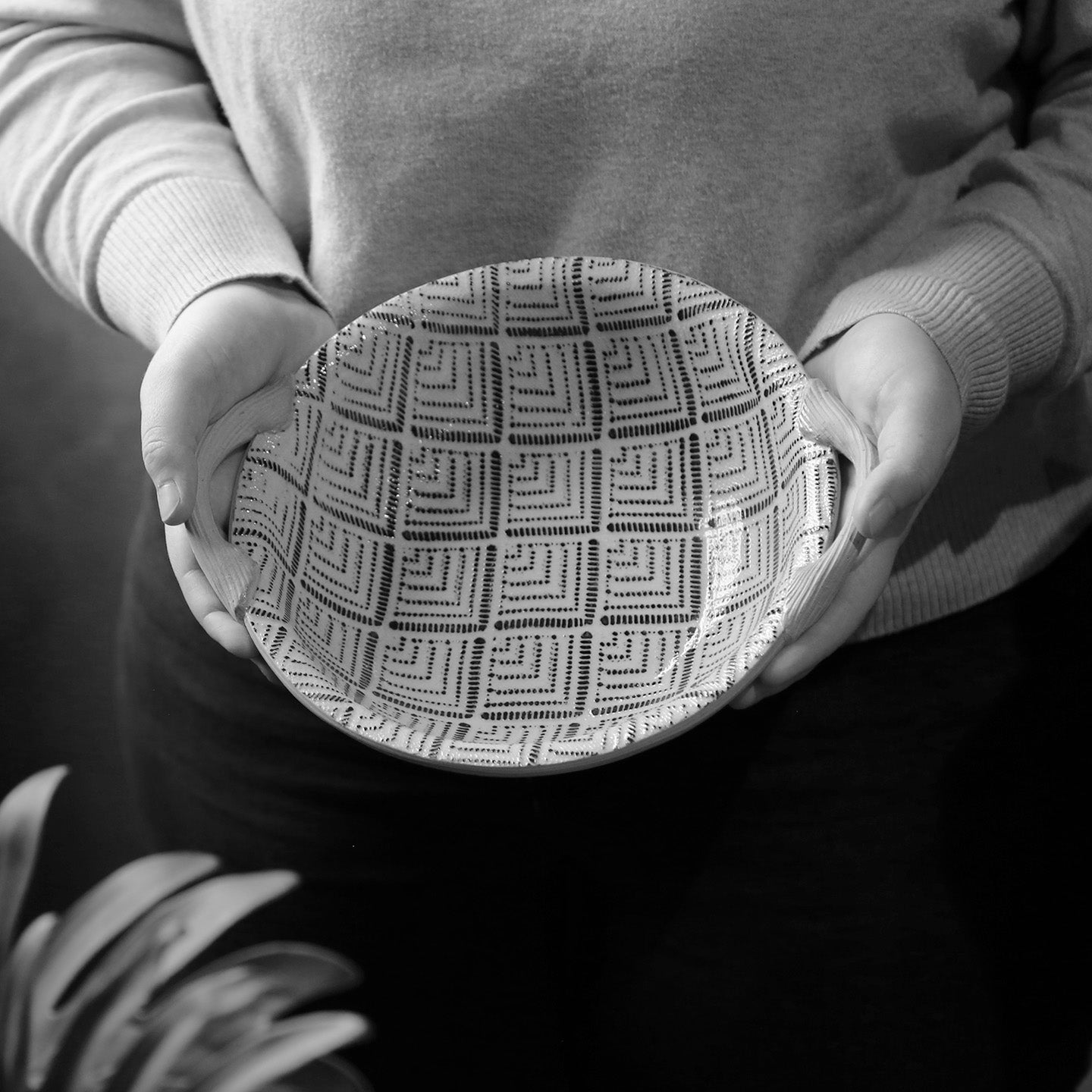 Handmade ceramic veggie bowl, with handles, made using a unique process of glazing over lace and materials to create gorgeous designs and texture. Each piece is signed and dated on the bottom.