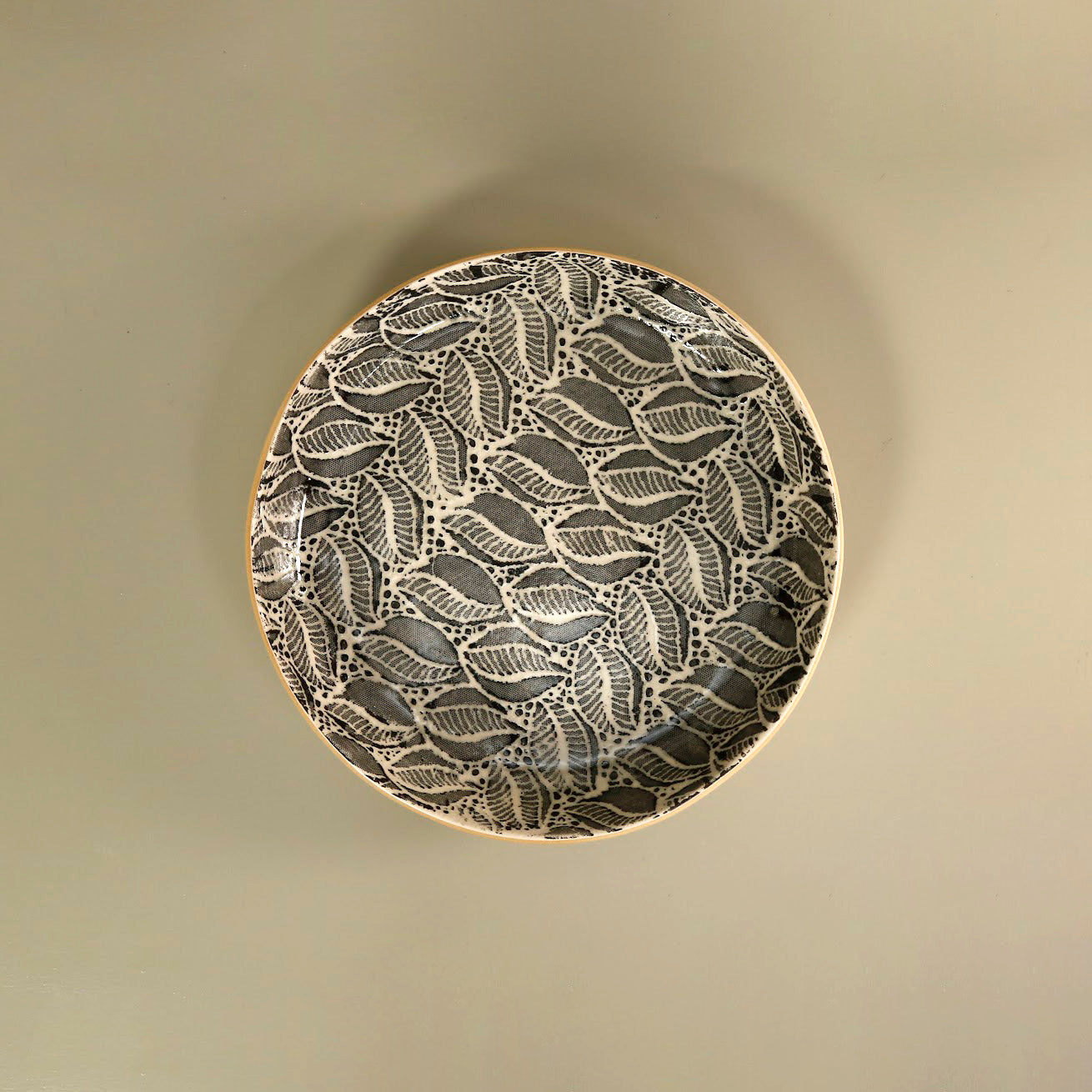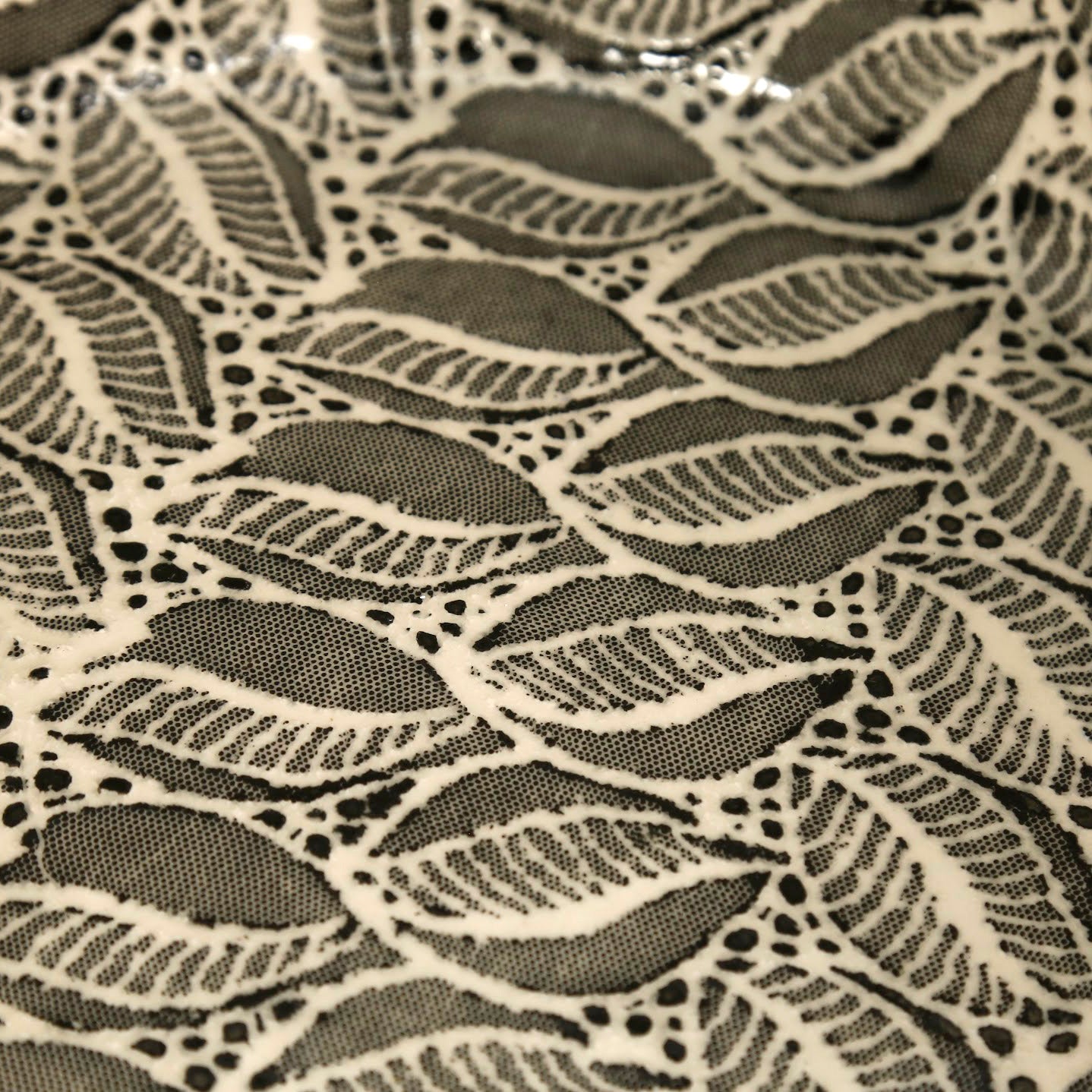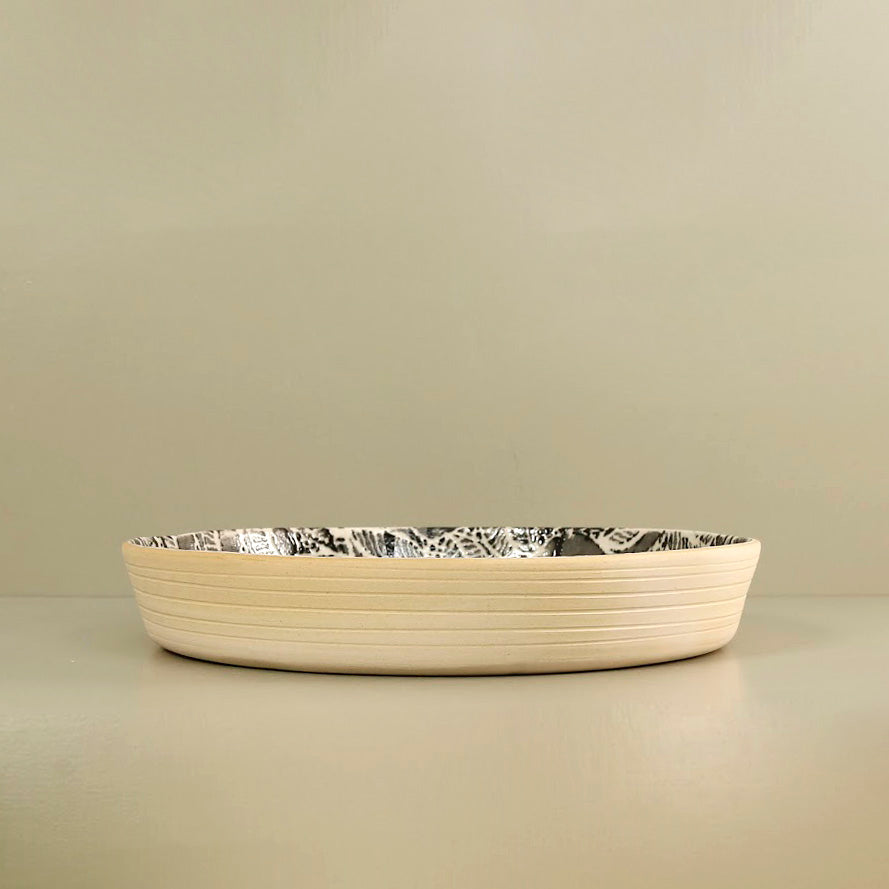 Handmade ceramic platter made using a unique process of glazing over lace and materials to create gorgeous designs and texture. This piece is signed and dated on the bottom.
