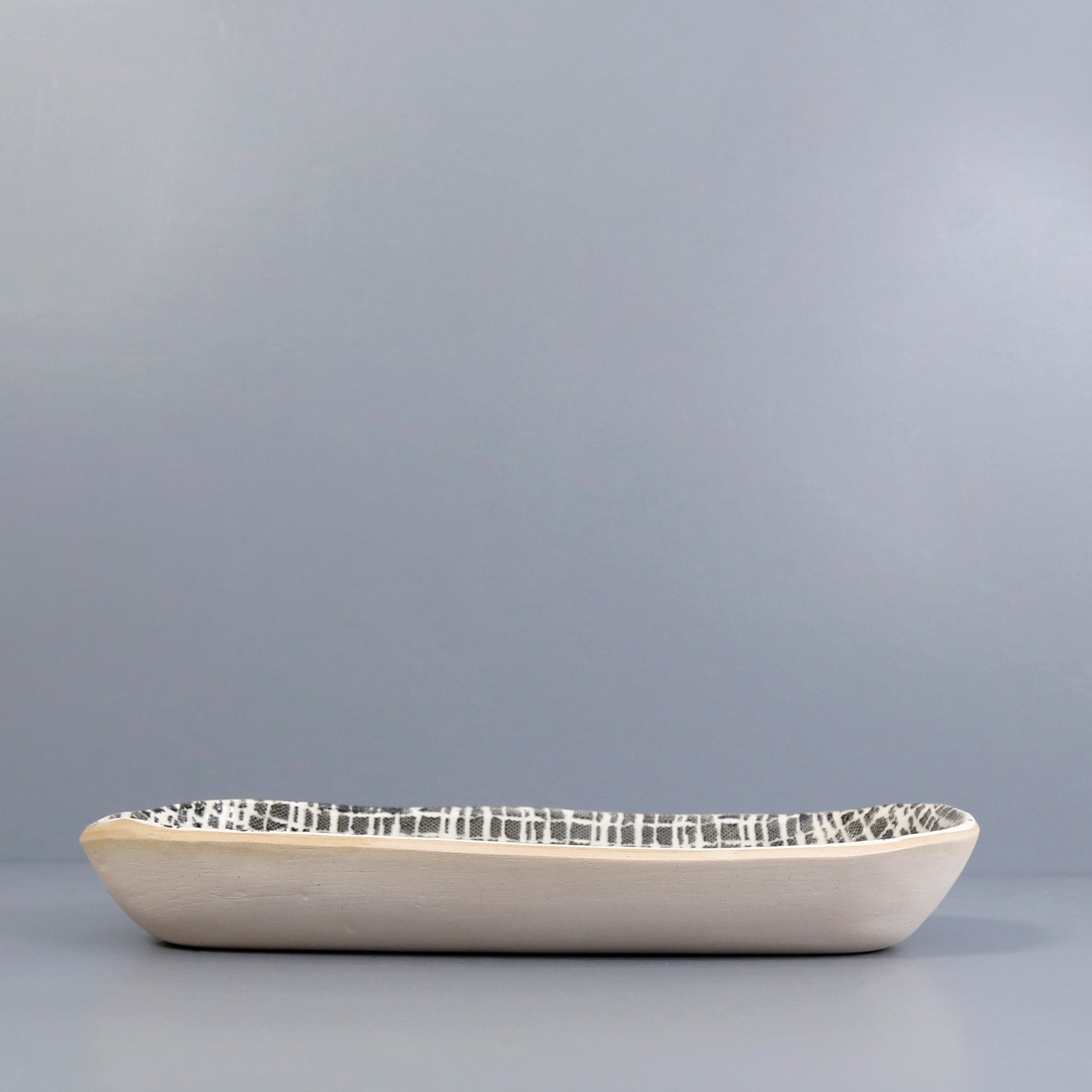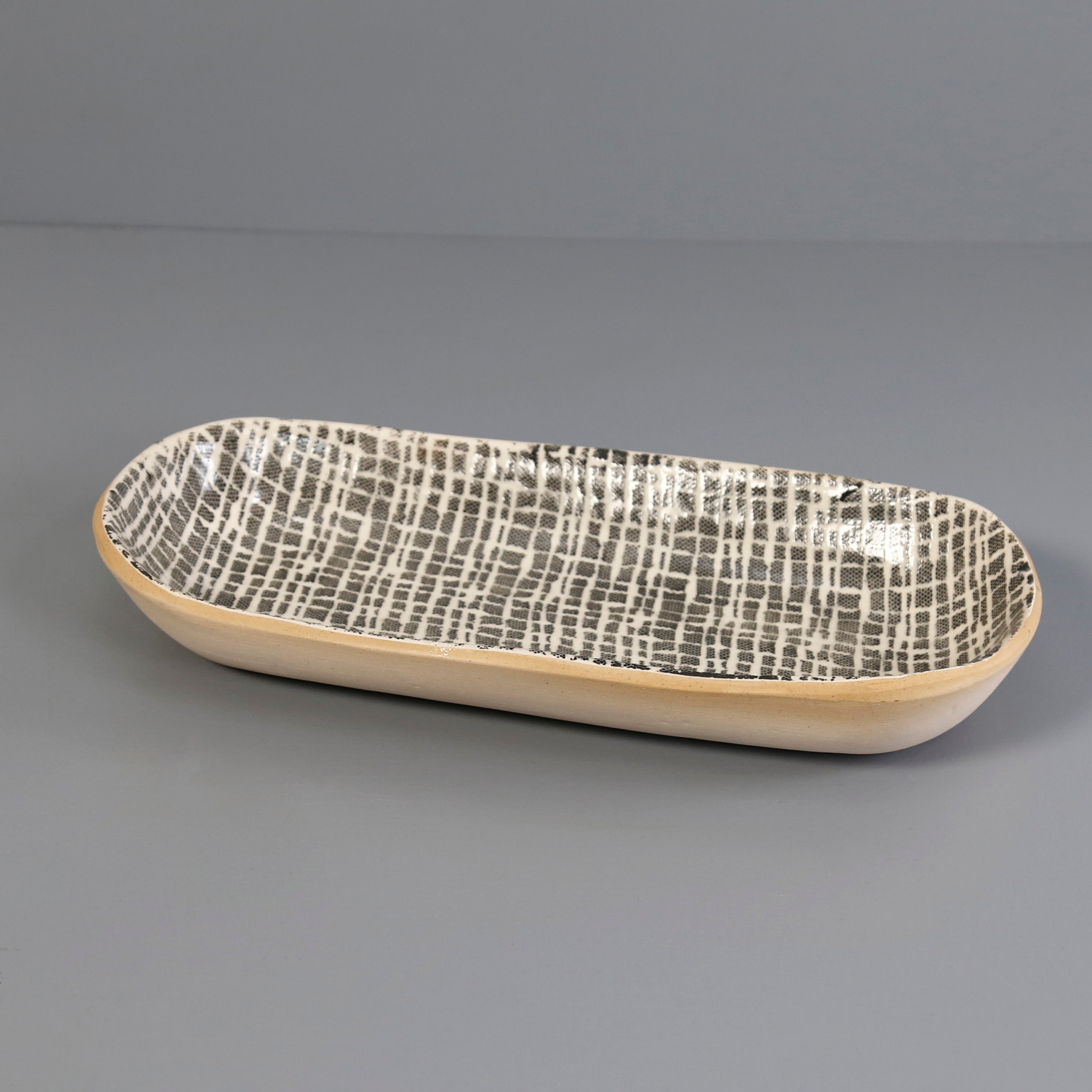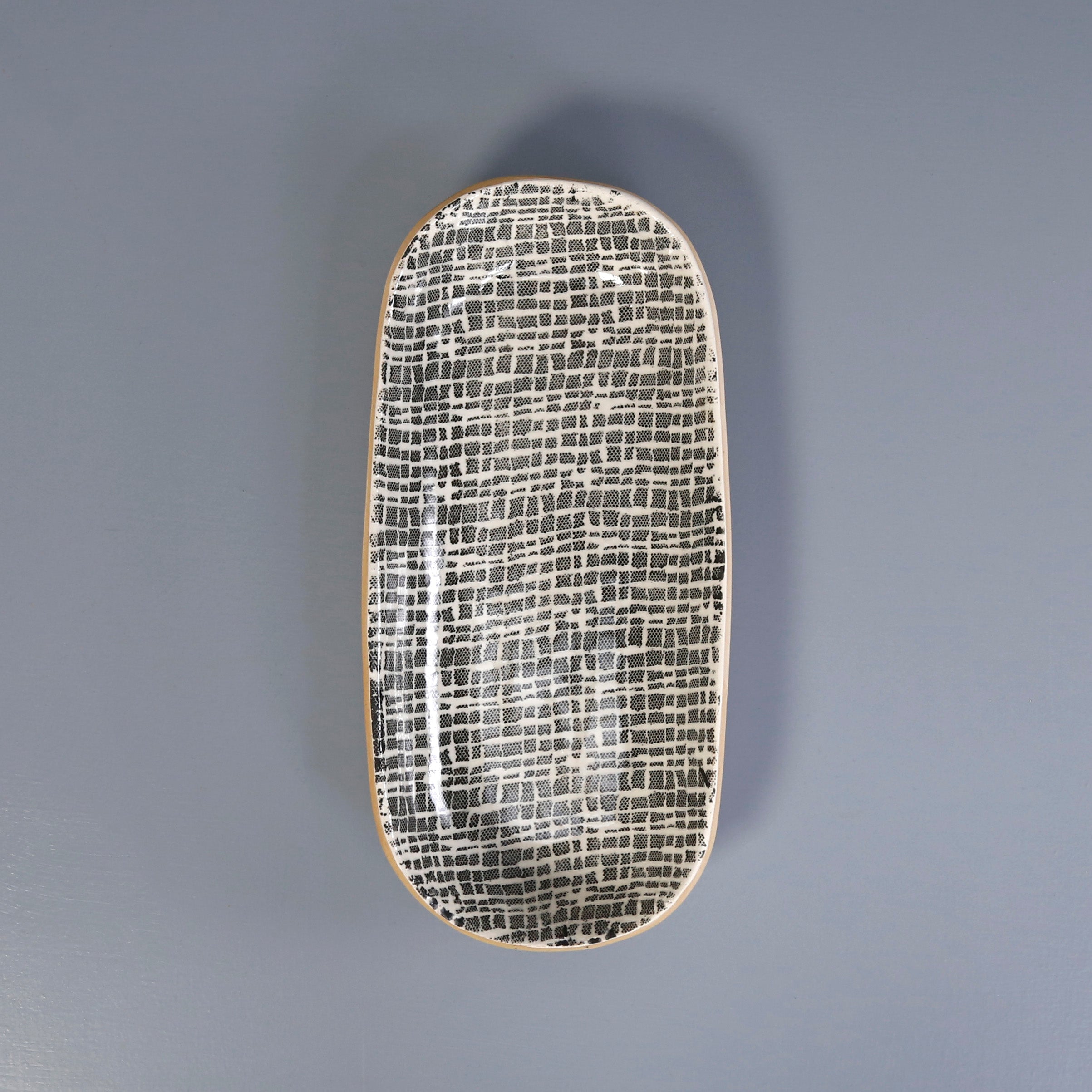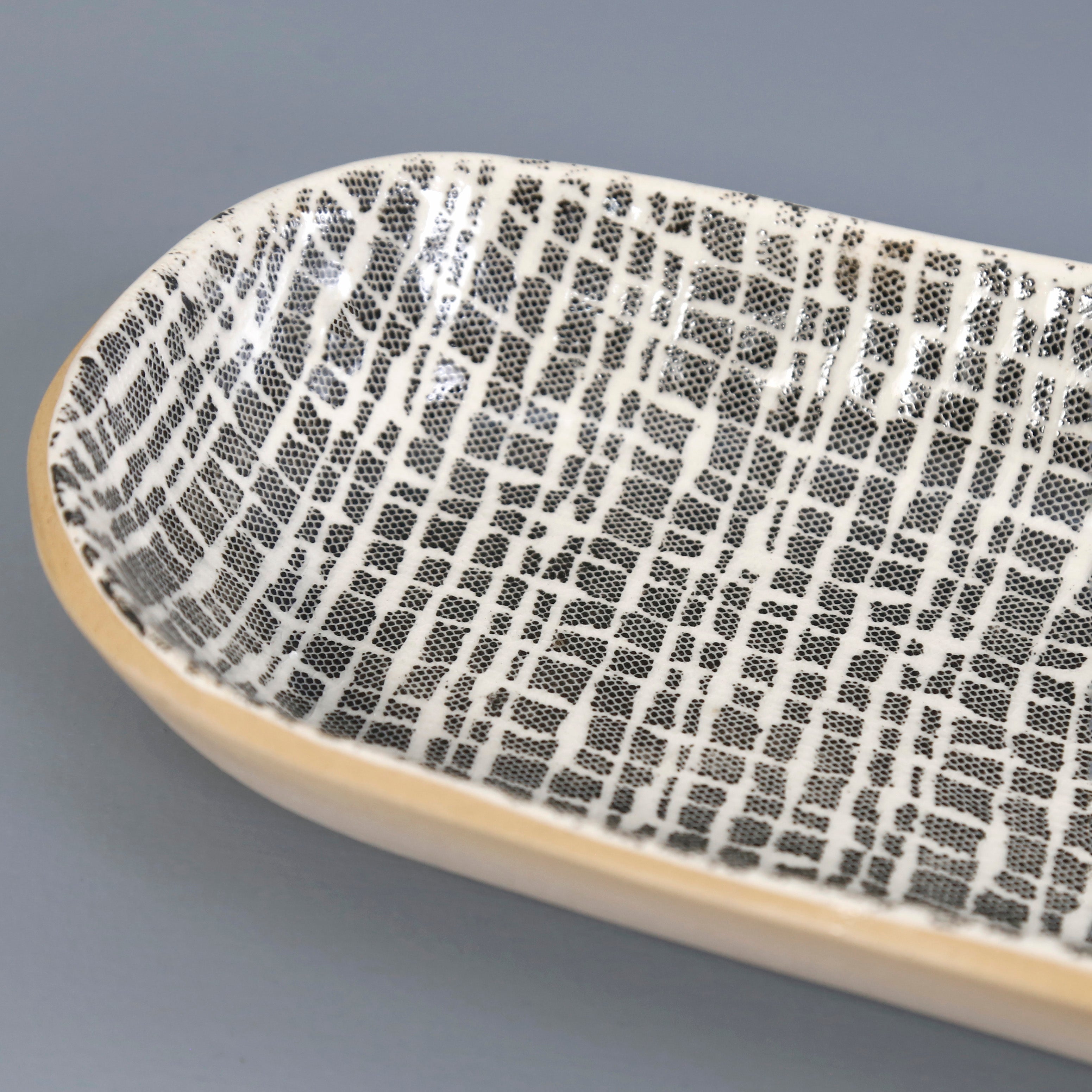 Handmade ceramic tray made using a unique process of glazing over lace and materials to create gorgeous designs and texture. Each piece is signed and dated on the bottom. Food safe.