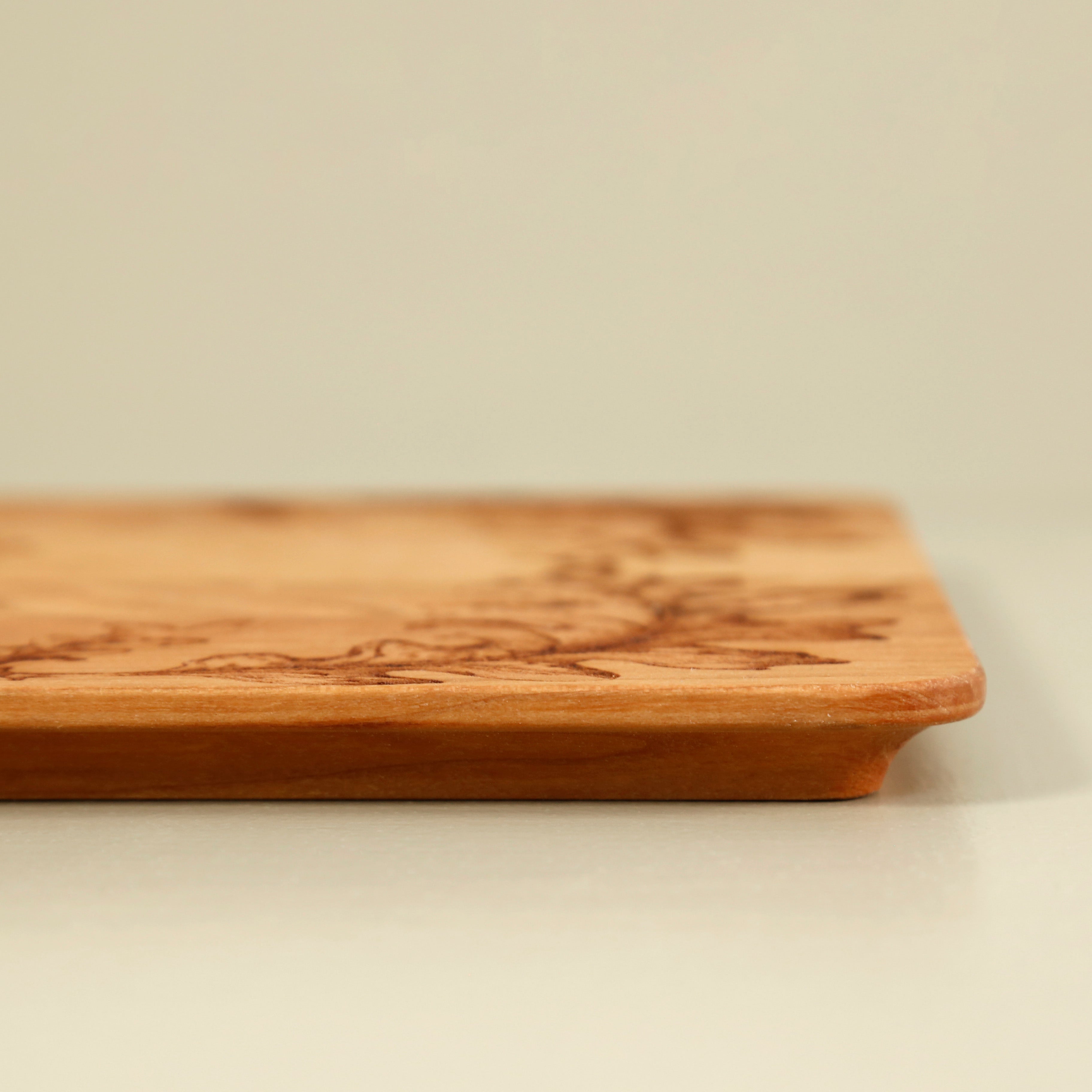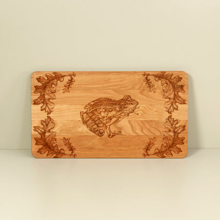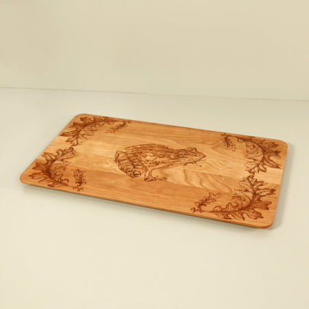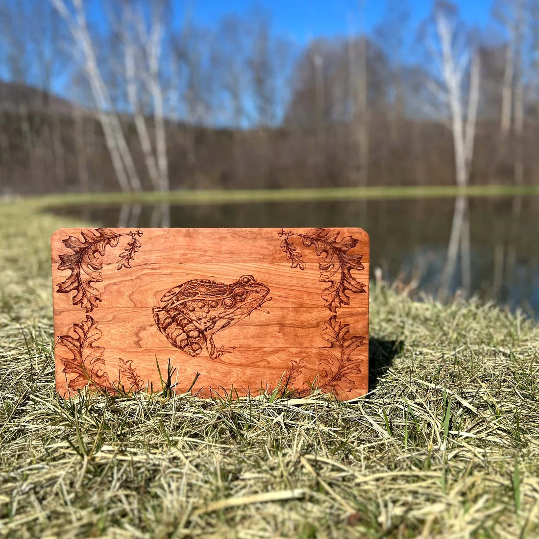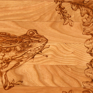 This cherry essential serving board features Vermont Artist's Laura Zindel's stunning artwork and an expertly engraved American Frog design. Crafted with cherry wood, this board is not only a functional addition to your kitchen but also a beautiful piece of art. Elevate your serving experience and add a touch of nature-inspired elegance with this unique board.