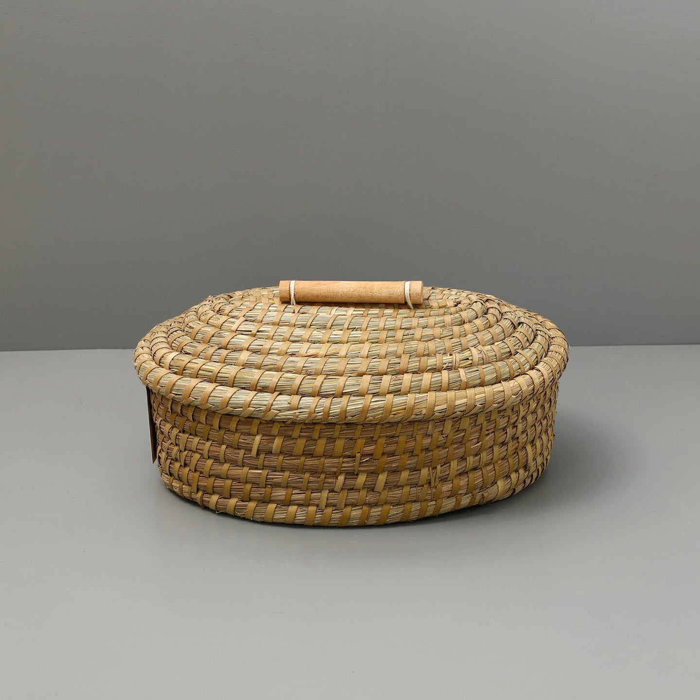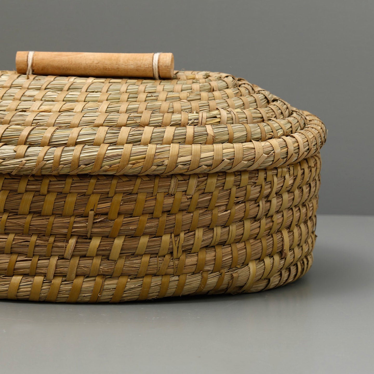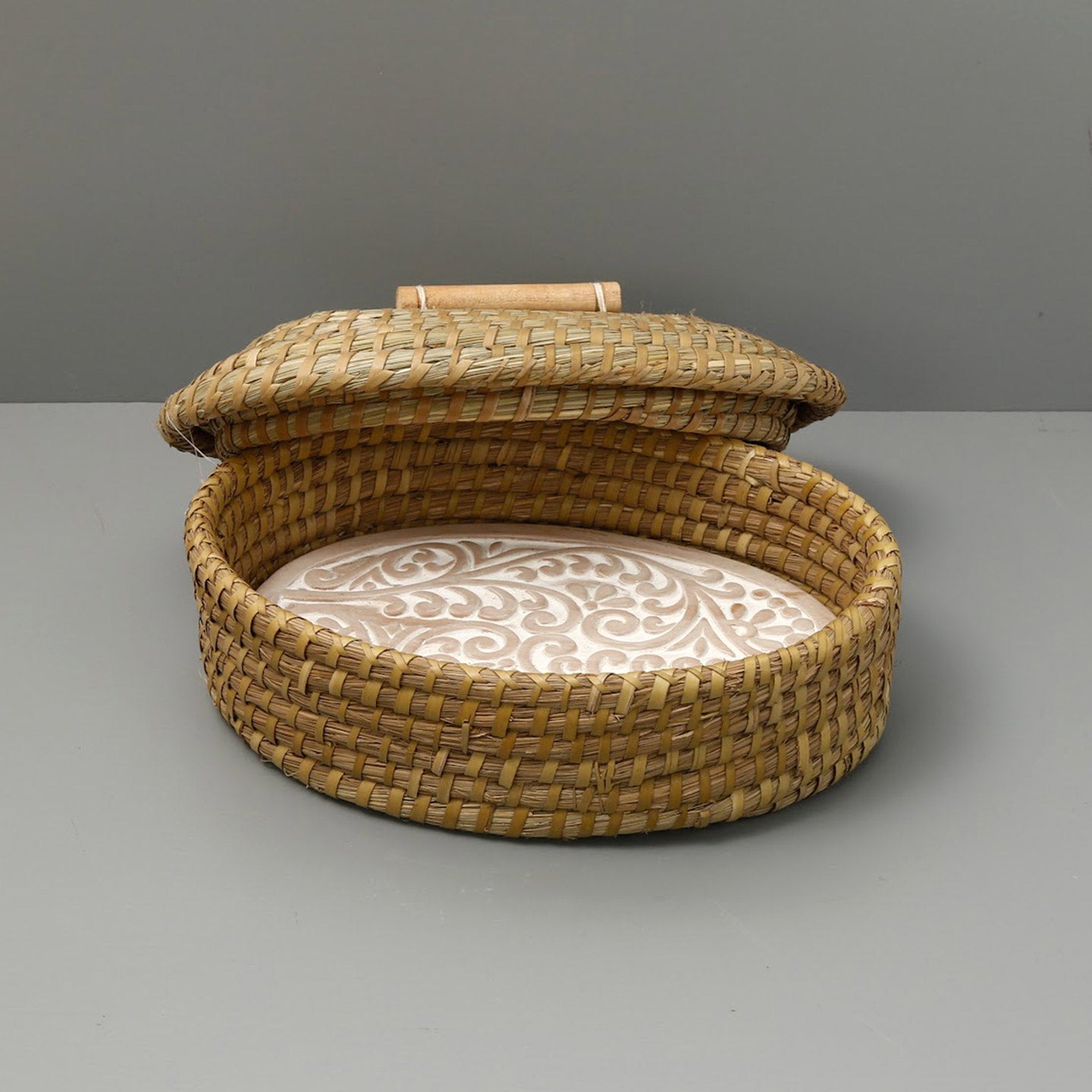 Keep bread and baked goods warm with this handcrafted basket and terracotta stone duo. The kaisa grass basket features a fitted lid with mahogany handle to retain heat, while the Double Vine design adds natural charm to your table. Perfect for bread, tortillas, chips, and more.