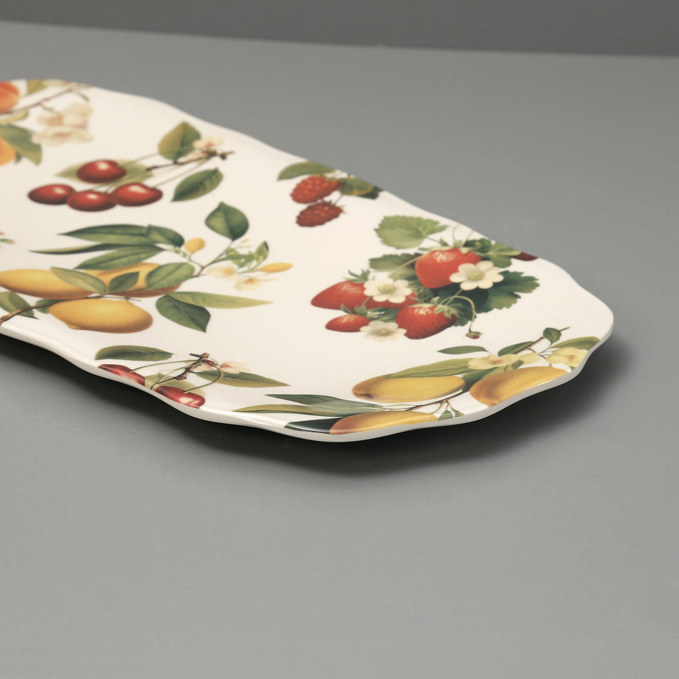 The Fruitstand serveware highlights richly illustrated cherries, lemons, peaches and strawberries, along with ripe watermelon in a perfect blend. Melamine and plastics mimic the aesthetic of ceramic and glass, while being shatterproof, dishwasher safe, and completely durable which makes them ideal for both indoor and outdoor entertaining. These products are completely BPA-free melamine and plastics.