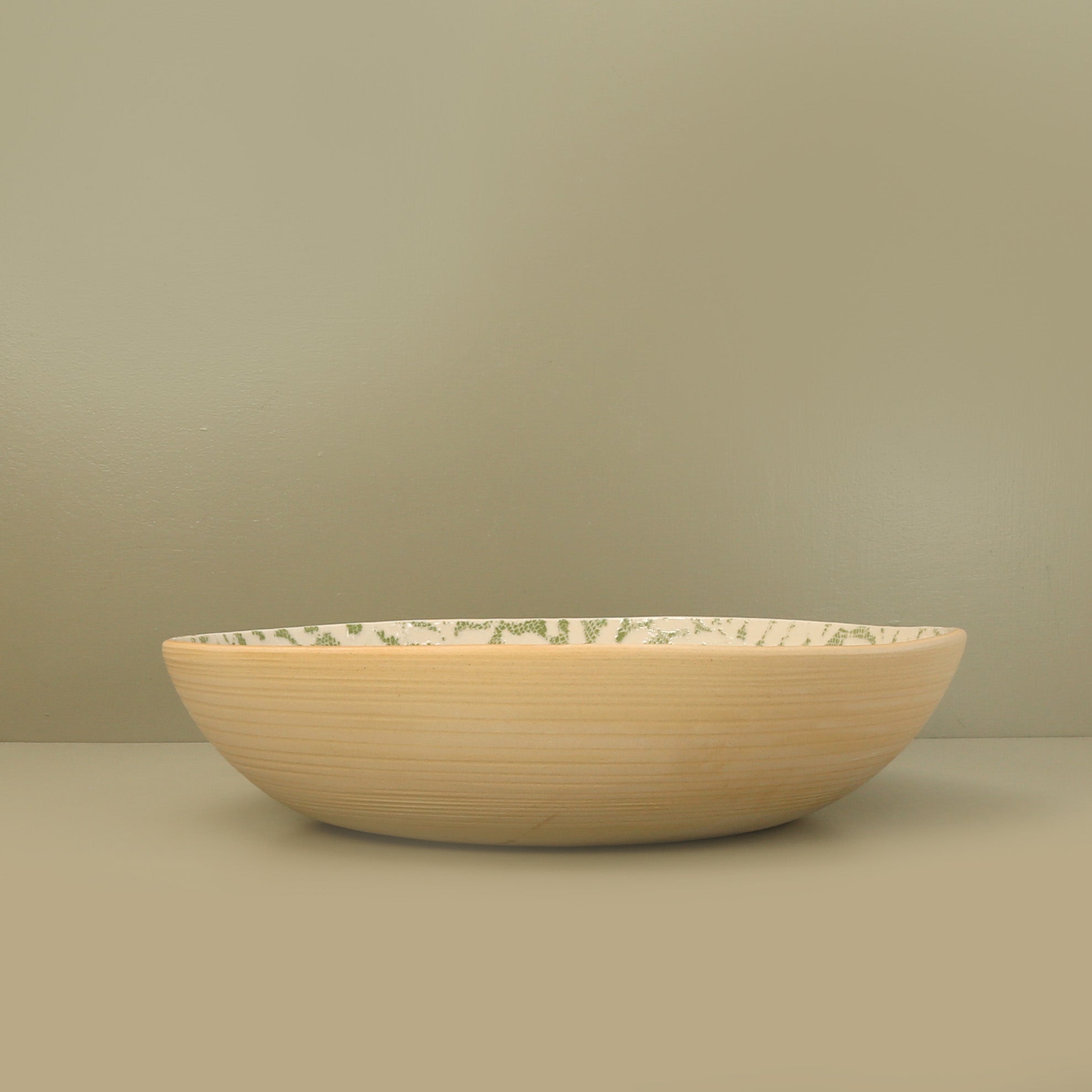 Handmade ceramic XL serving bowl made using a unique process of glazing over lace and materials to create gorgeous designs and texture. Each piece is signed and dated on the bottom.