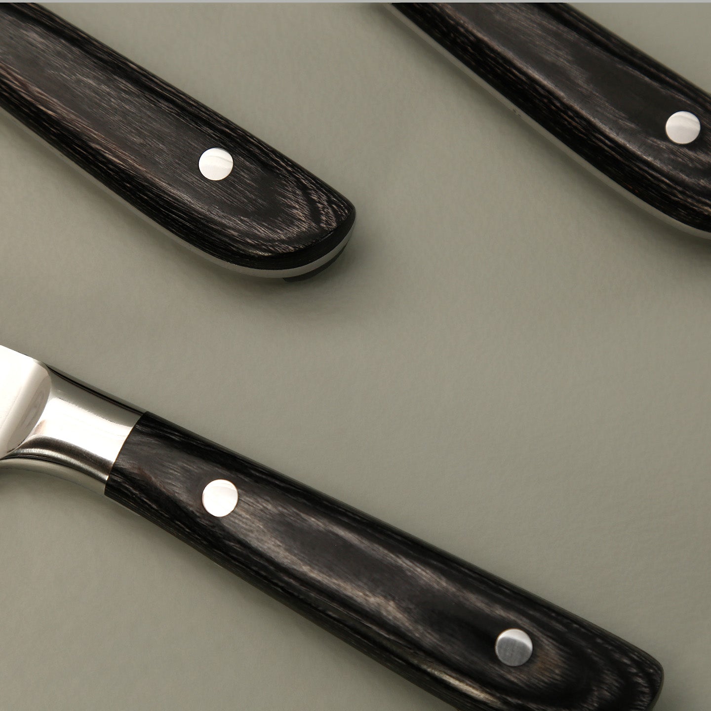 Four piece set of fine edged steak knives. Each 5" knife is forged from Japanese Damascus stainless steel with a VG10 cutting core, offering performance, durability, and impressive rust resistance. They have full-tang construction, solid bolsters, and double-riveted ebony Pakkawood handles to ensure perfect balance, control, and a warm, natural feel in your hand. Designed for smooth, precise cuts through any steak or roast, these knives bring professional-grade craftsmanship to your dining table. Beautifully balanced, incredibly sharp, and built for a lifetime of meals worth savoring.