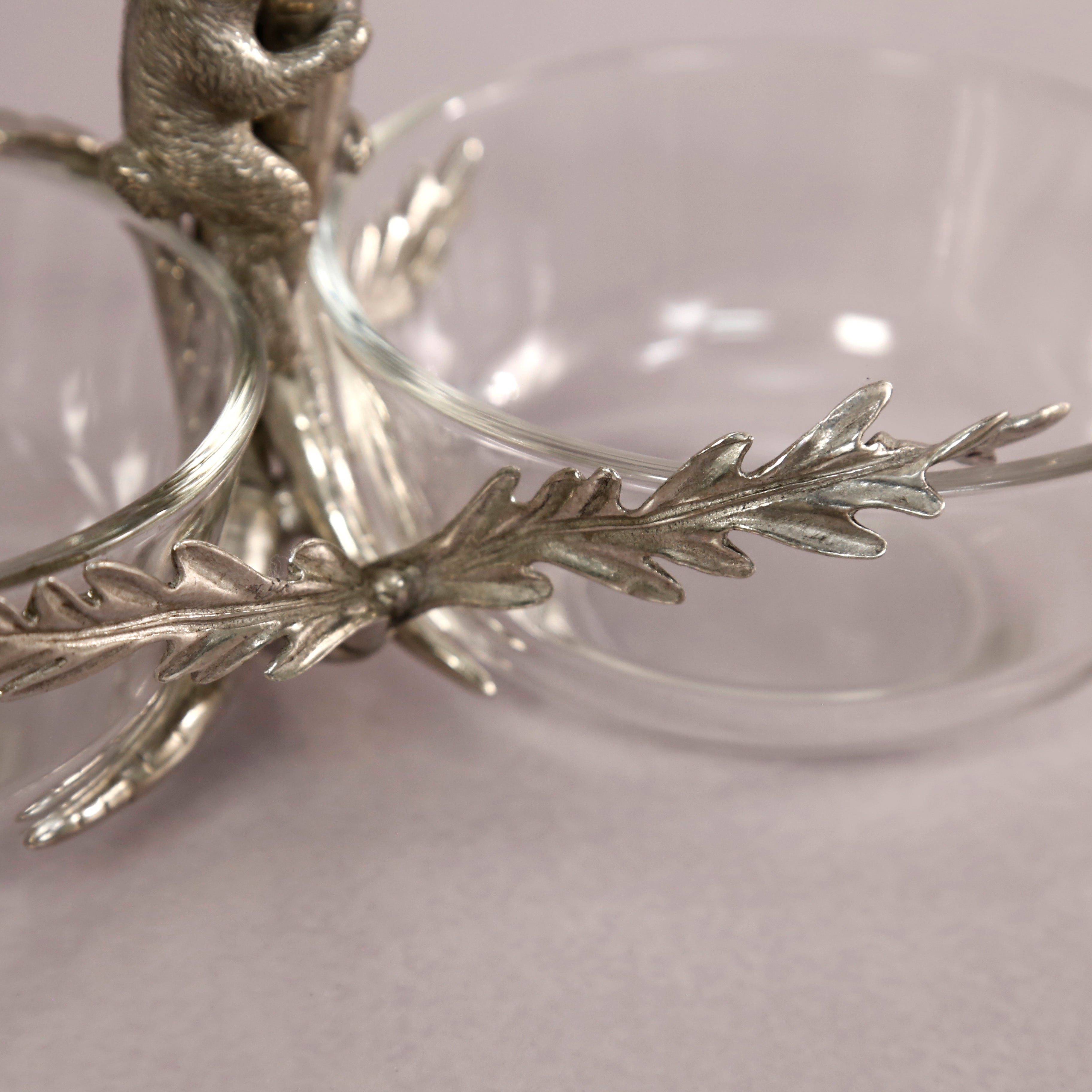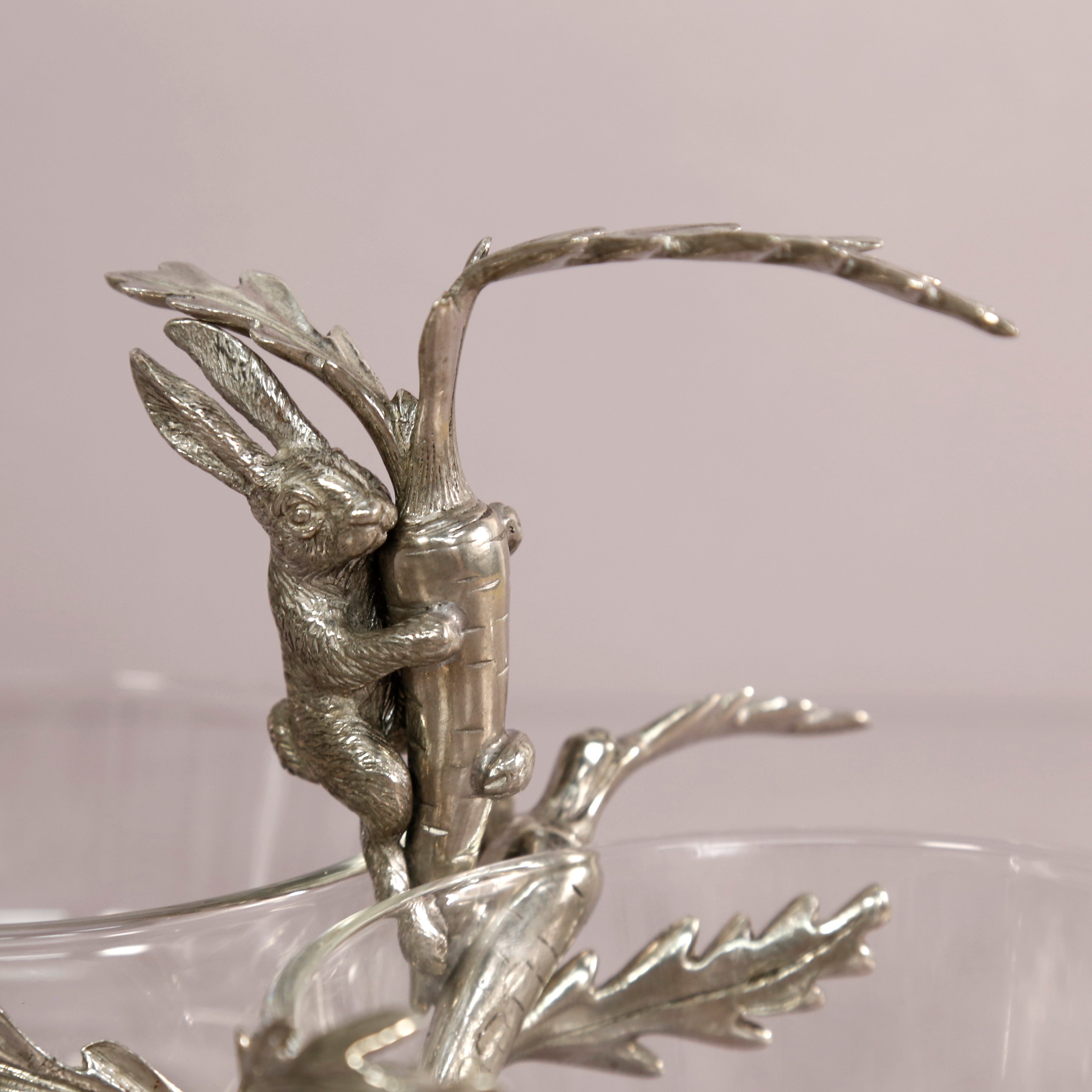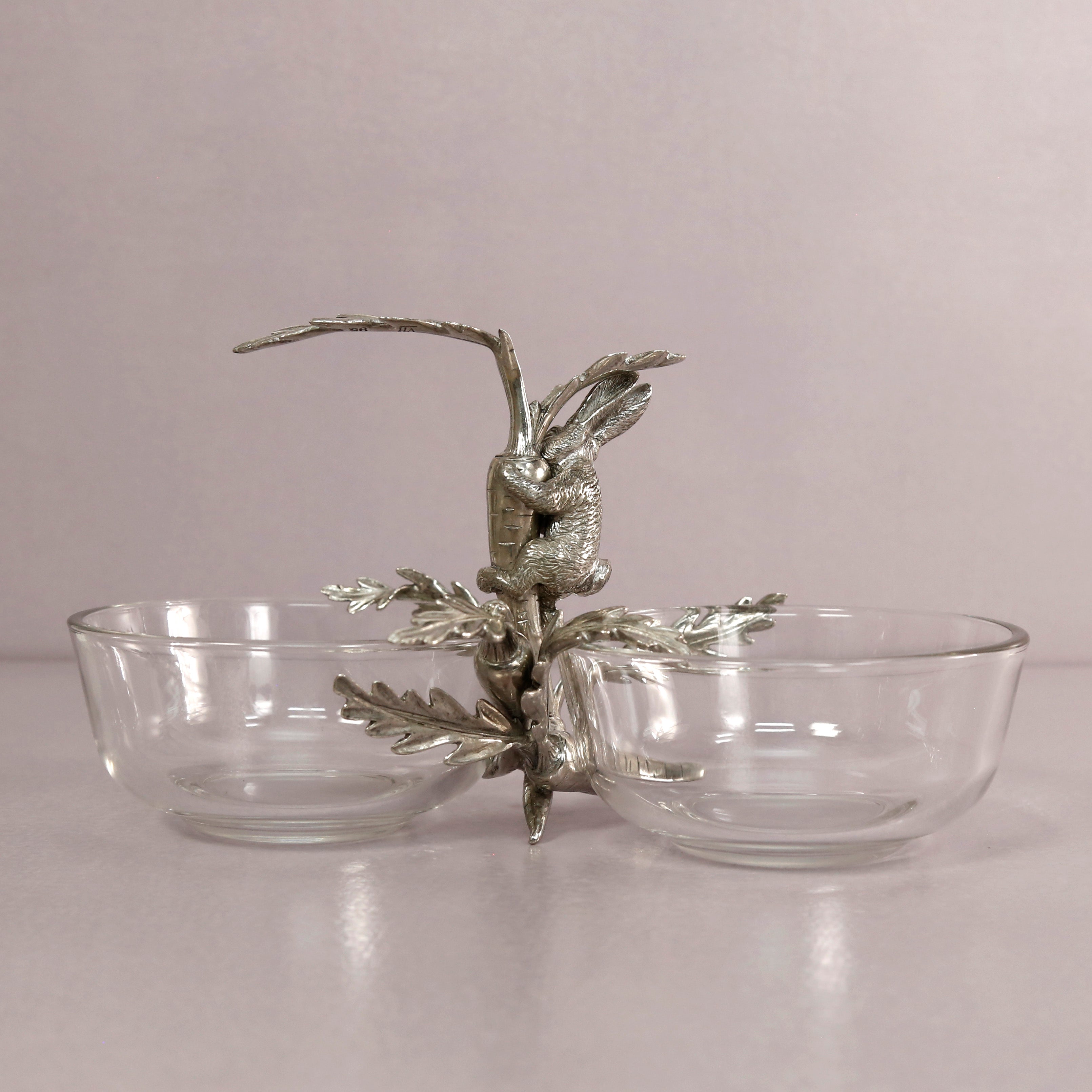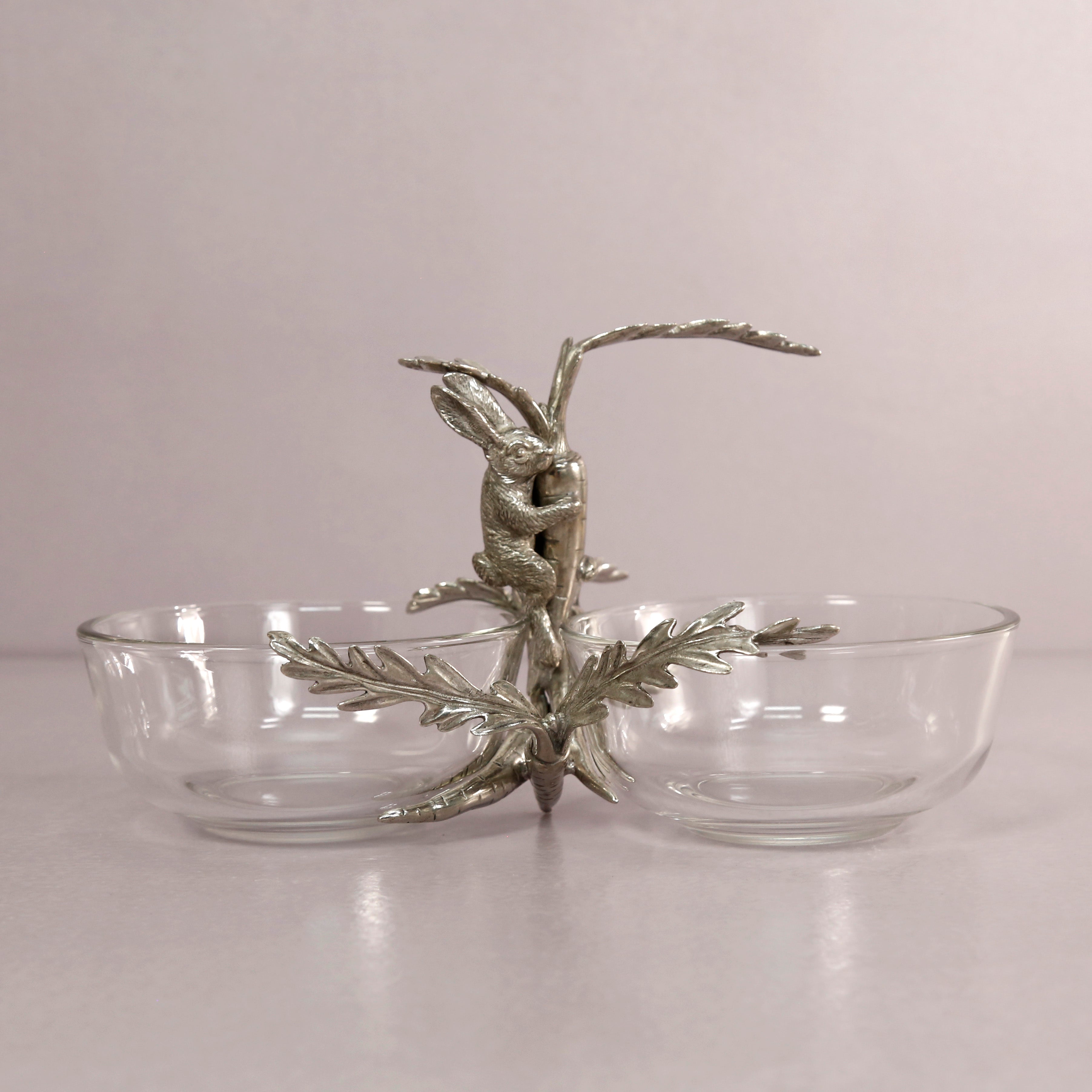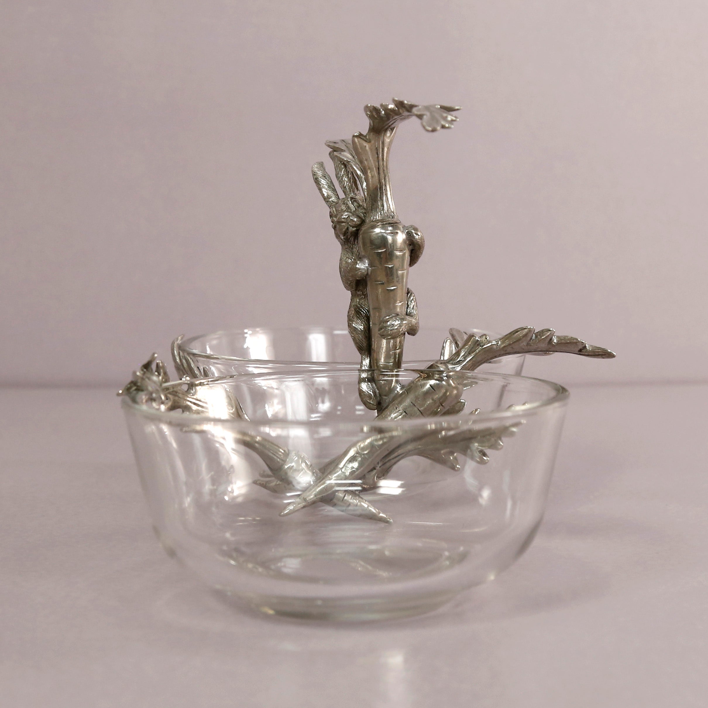 Bring lighthearted whimsy to springtime gatherings and with this double-dish serving piece ideal for nuts, jams, salsas and dips. A tiny bunny clinging to a giant carrot inspires smiles all around at brunch buffets and sit-down meals. Remarkably detailed and irresistibly adorable, this enchanting double-dish server is handcrafted from luxury-grade pure pewter and Italian glass.