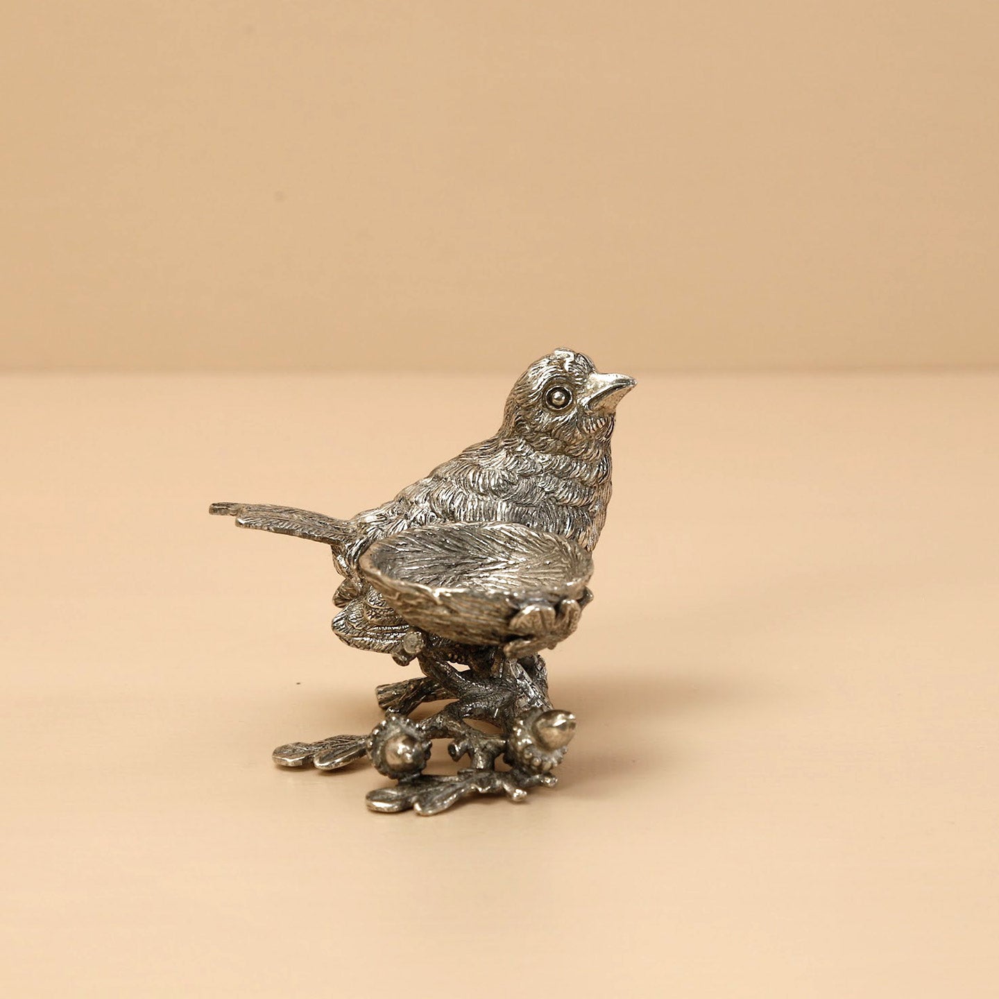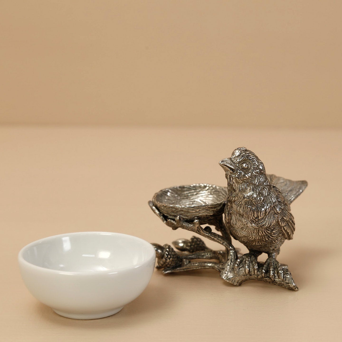 Small in size but big in detail , the Song Bird Salt Cellar is a study in miniature pewter art. A petite pewter nest rests on an oak branch with tiny acorns at the end. Cozied next to it rests a sweet songbird. Fill the stoneware cellar with salt or spice and place into the nest and the artwork is ready for your table. Inspired by a flock of song sparrows that nest in California. Holds a generous two Tablespoons of your favorite spice