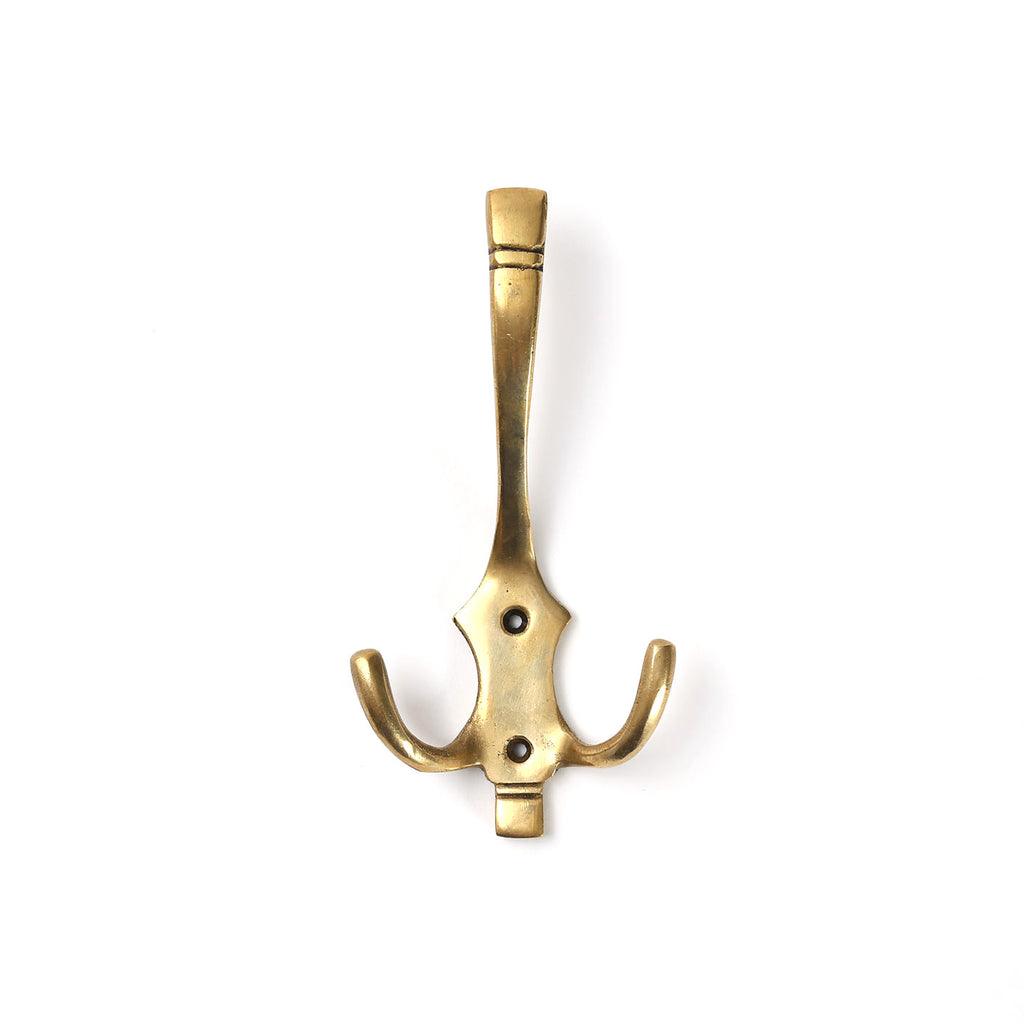 A wall hook crafted from brass, featuring three prongs and accompanying hardware.
