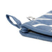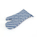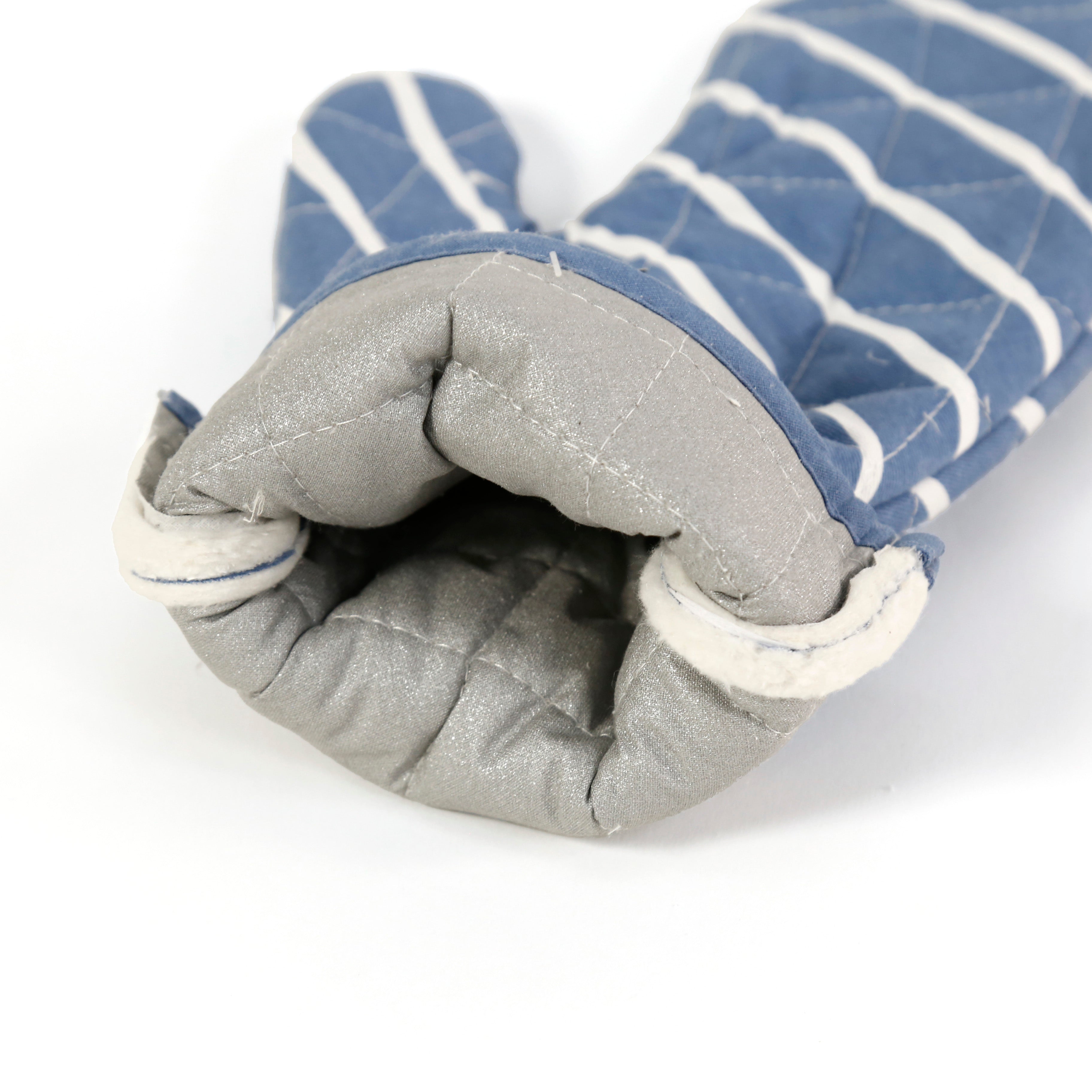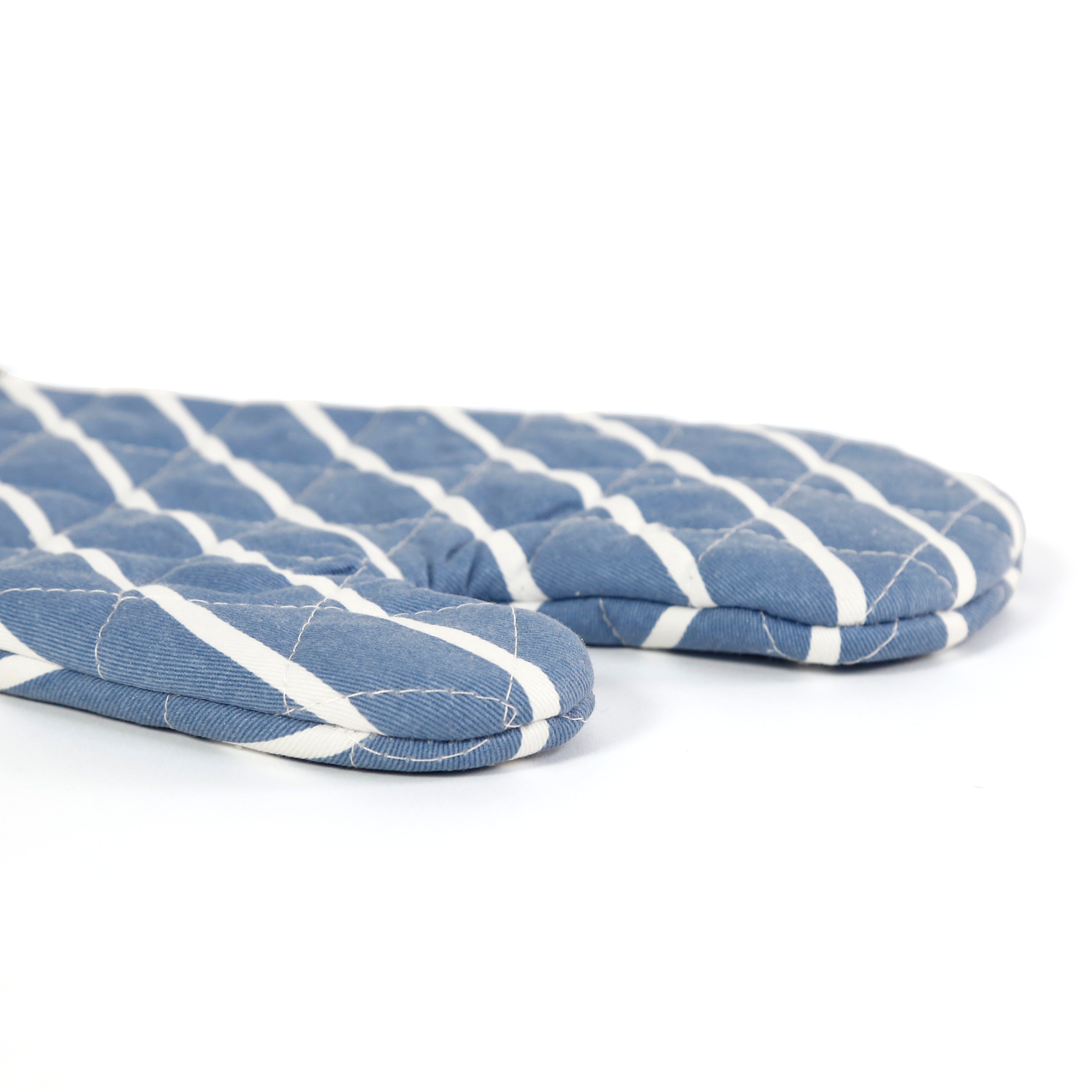 This quilted oven mitt features a blue hue with white stripes and pairs with a convenient hanging loop.